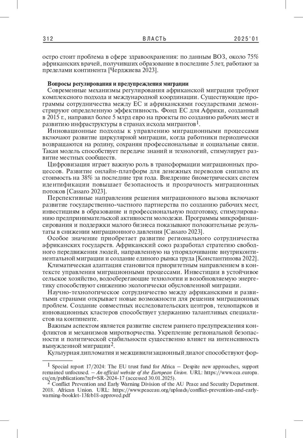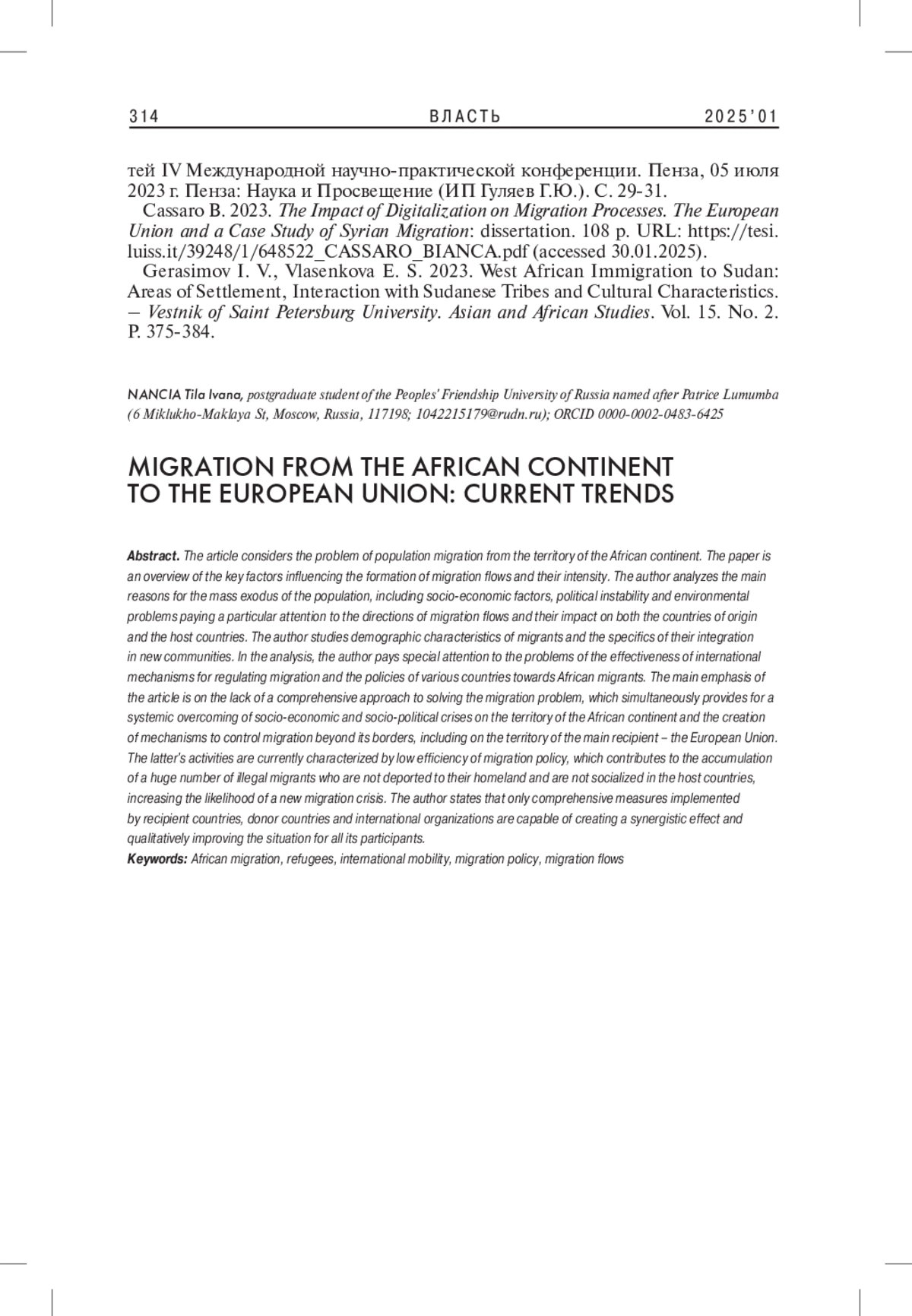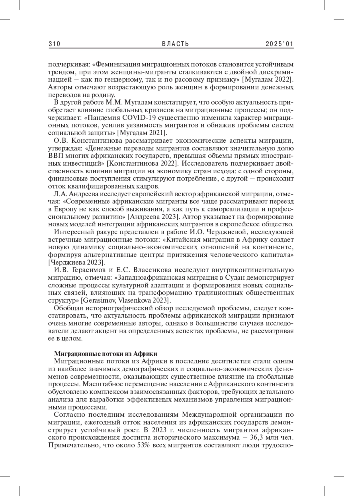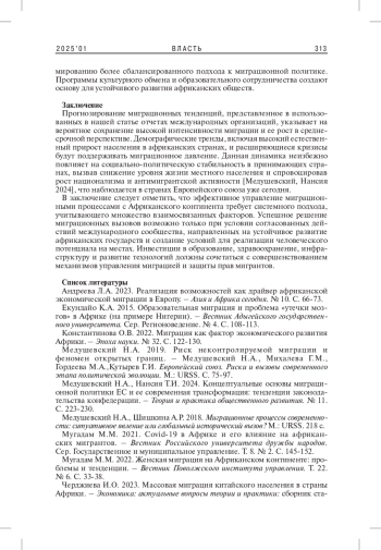 1. 	Андреева Л.А. 2023. Реализация возможностей как драйвер африканской экономической миграции в Европу. - Азия и Африка сегодня. № 10. С. 66-73. EDN: UUVHDT
