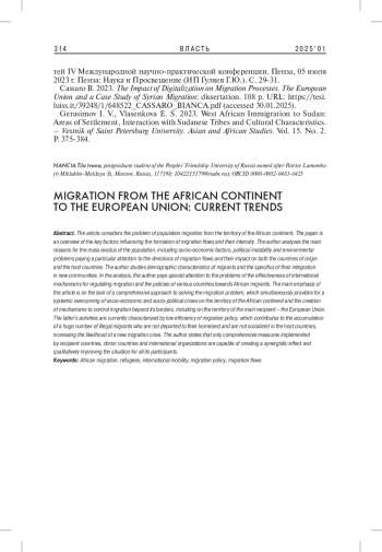 10. 	Cassaro B. 2023. The Impact of Digitalization on Migration Processes. The European Union and a Case Study of Syrian Migration: dissertation. 108 p. URL: https://tesi.luiss.it/39248/1/648522_CASSARO_BIANCA.pdf (accessed 30.01.2025).