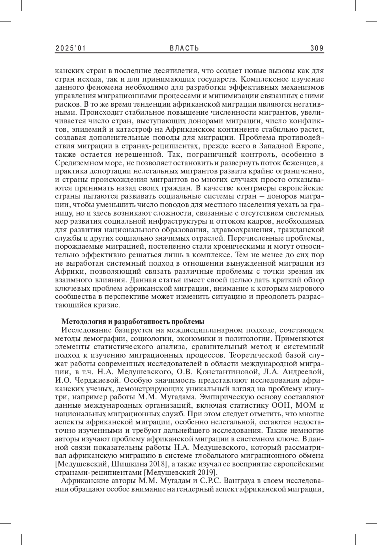 8. 	Мугадам М.М. 2022. Женская миграция на Африканском континенте: проблемы и тенденции. - Вестник Поволжского института управления. Т. 22. № 6. С. 33-38. EDN: FSAZVD