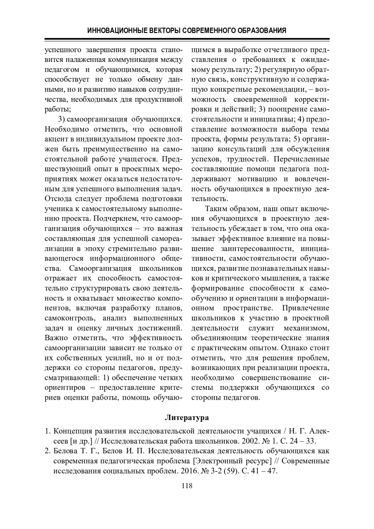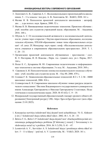2. Белова Т. Г., Белов И. П. Исследовательская деятельность обучающихся как современная педагогическая проблема [Электронный ресурс] // Современные исследования социальных проблем. 2016. № 3-2 (59). С. 41 - 47.