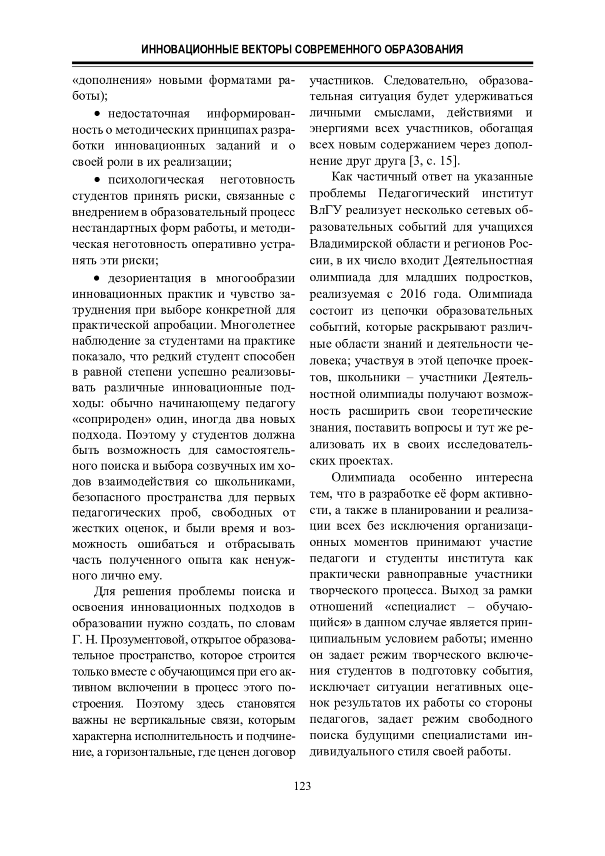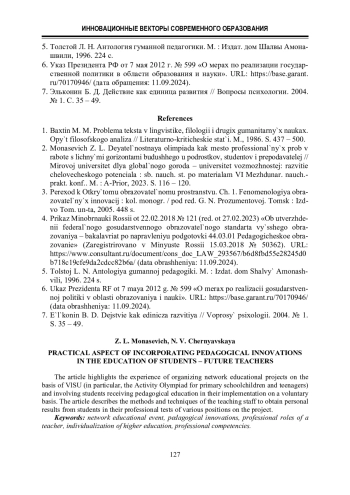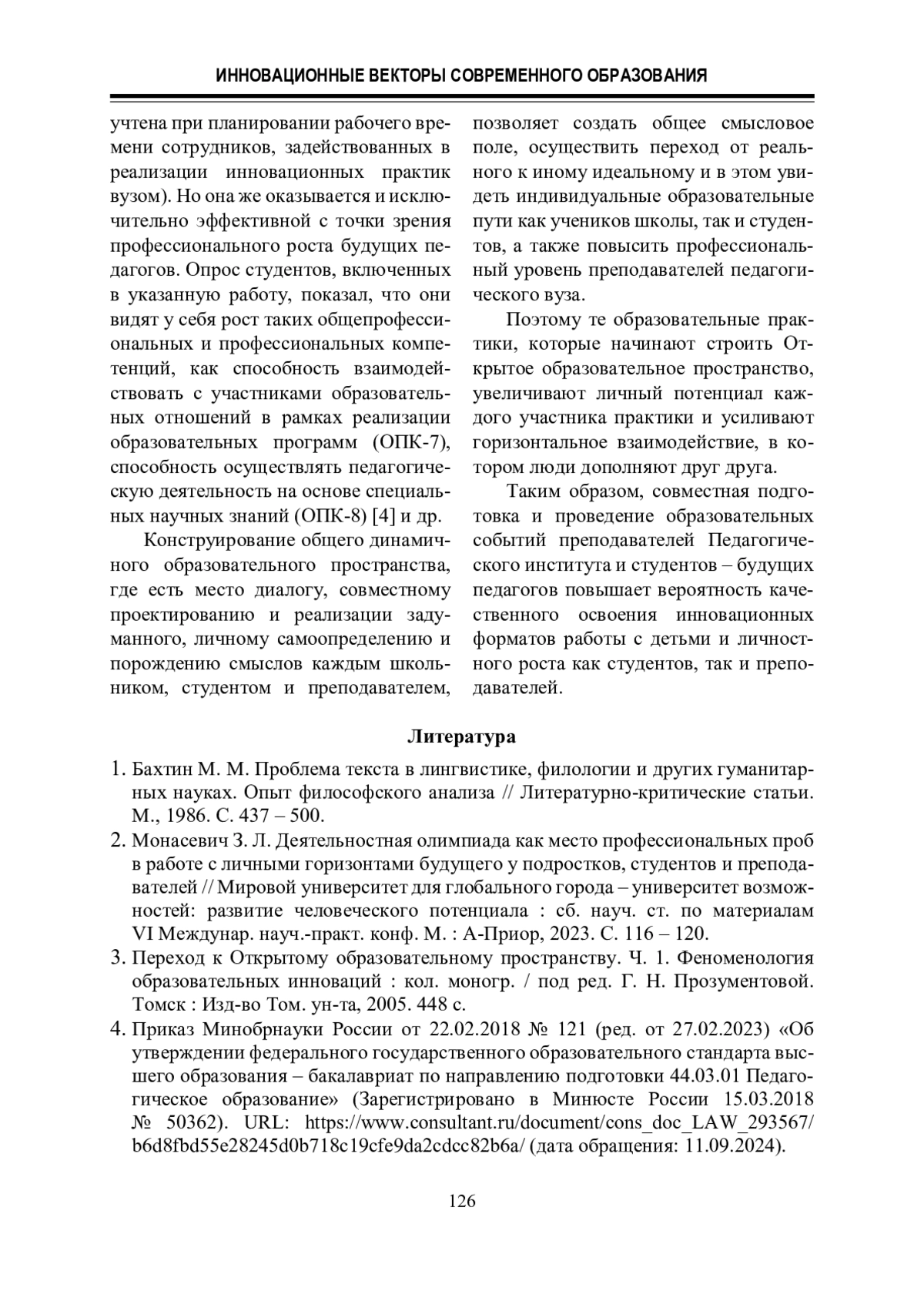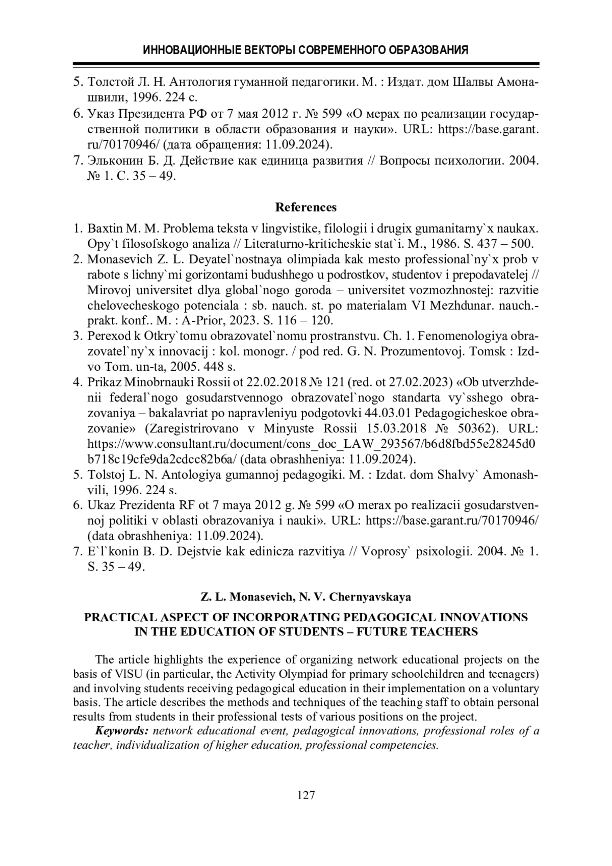 2. Монасевич З. Л. Деятельностная олимпиада как место профессиональных проб в работе с личными горизонтами будущего у подростков, студентов и преподавателей // Мировой университет для глобального города - университет возможностей: развитие человеческого потенциала : сб. науч. ст. по материалам VI Междунар. науч.-практ. конф. М. : А-Приор, 2023. С. 116 - 120.