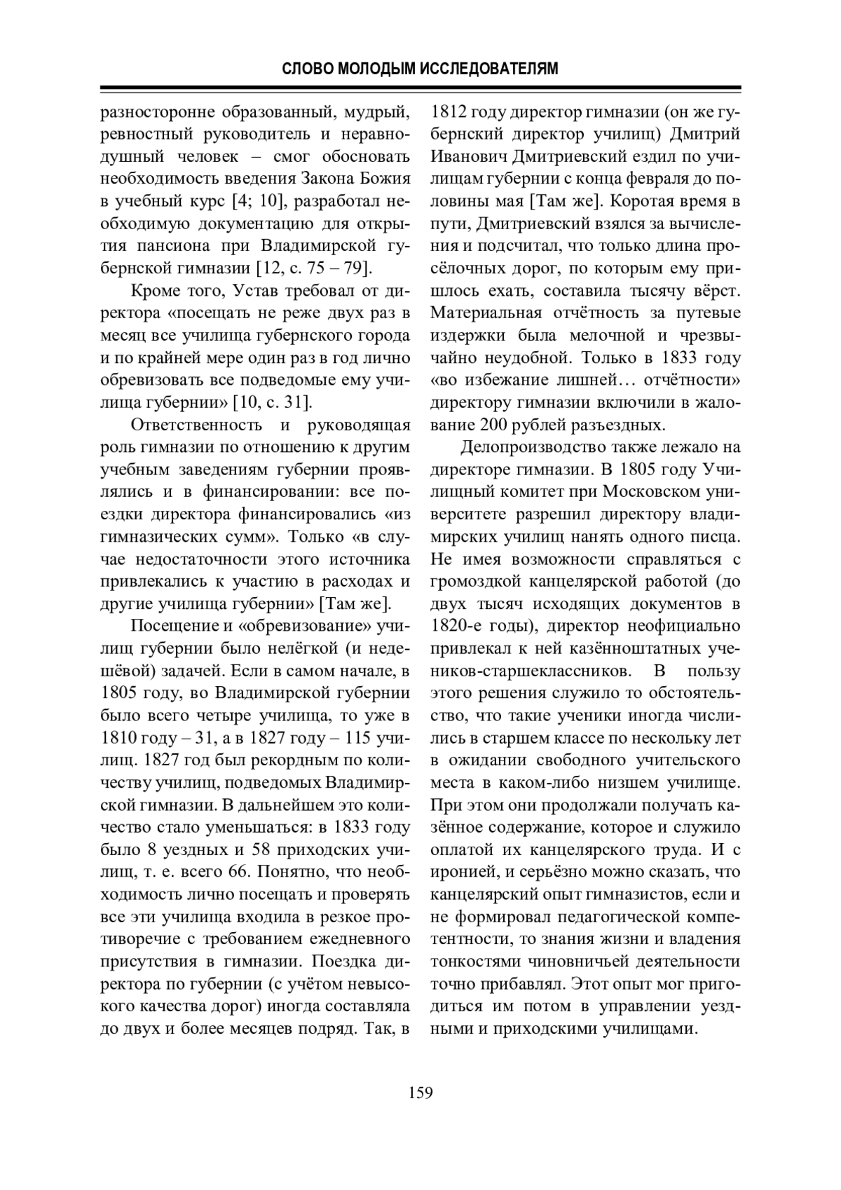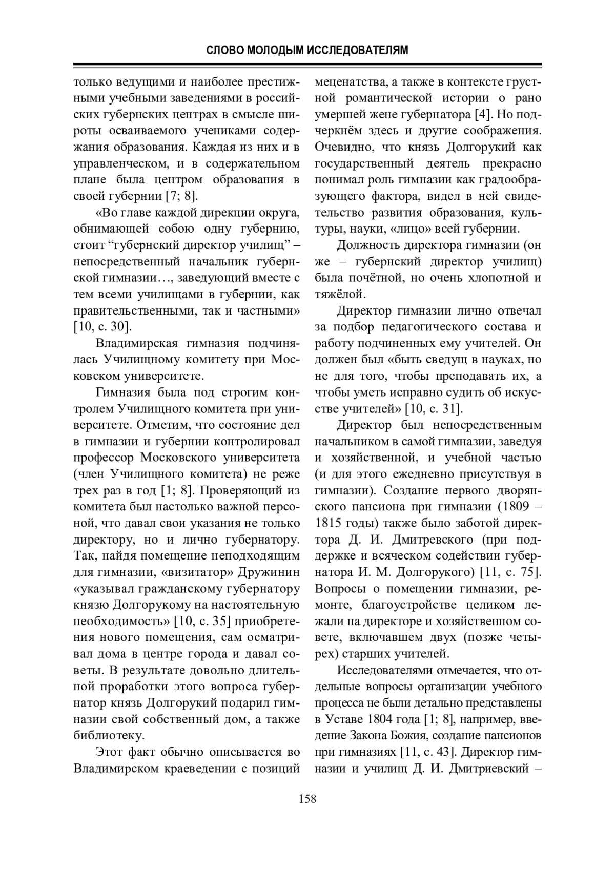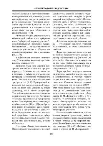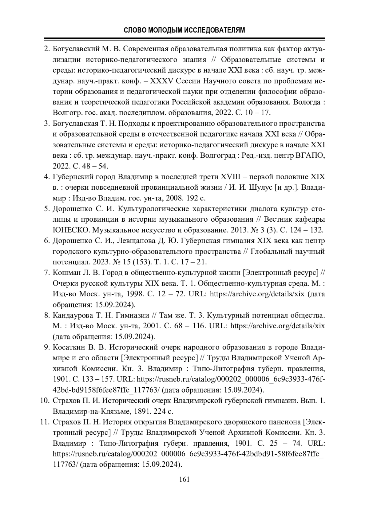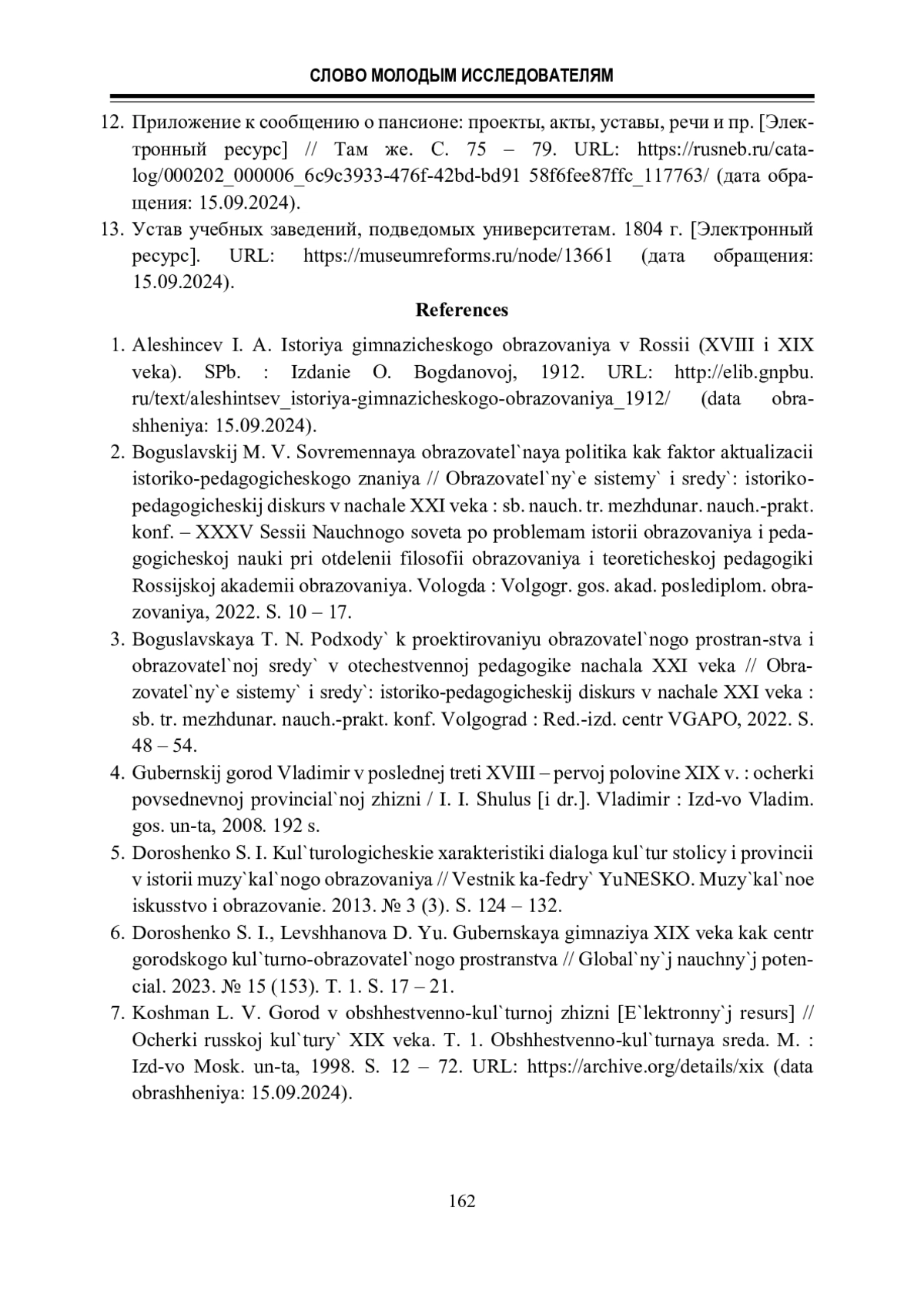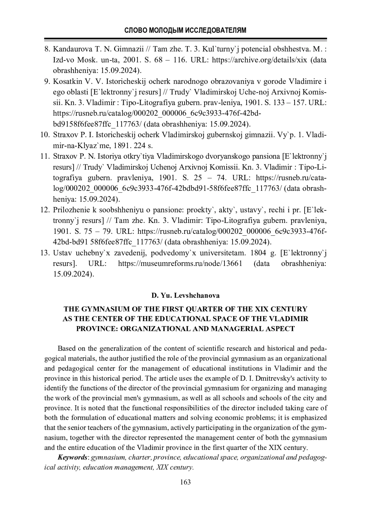 6. Дорошенко С. И., Левщанова Д. Ю. Губернская гимназия XIX века как центр городского культурно-образовательного пространства // Глобальный научный потенциал. 2023. № 15 (153). Т. 1. С. 17 - 21.
