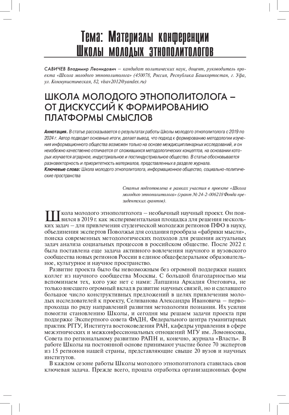 В статье рассказывается о результатах работы Школы молодого этнополитолога с 2019 по 2024 г. Автор подводит основные итоги, делает вывод, что подход к формированию методологии изучения информационного общества возможен только на основе междисциплинарных исследований, и он неизбежно качественно отличается от сложившихся методологических концептов, на основании которых изучается аграрное, индустриальное и постиндустриальное общество. В статье обосновывается разновекторность и приоритетность материалов, представленных в разделе журнала.