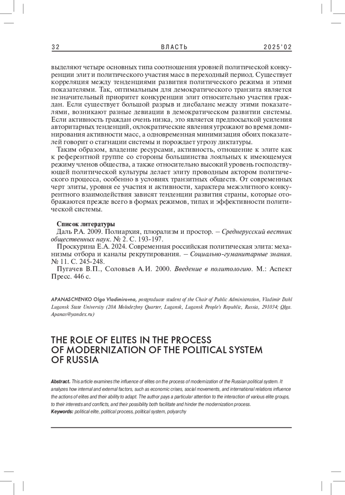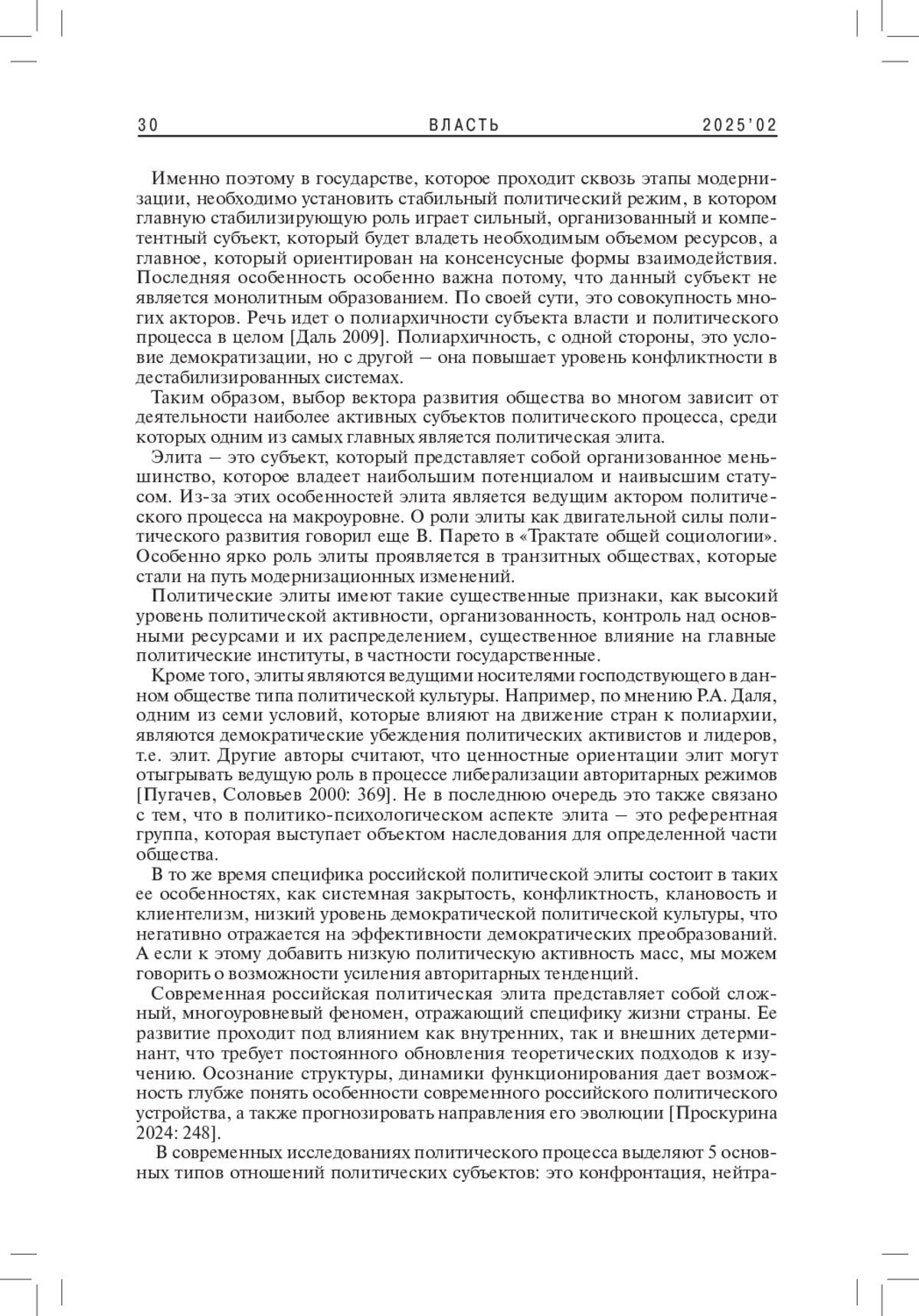 1. 	Даль Р.А. 2009. Полиархия, плюрализм и простор. - Среднерусский вестник общественных наук. № 2. С. 193-197. EDN: MSMXGD
