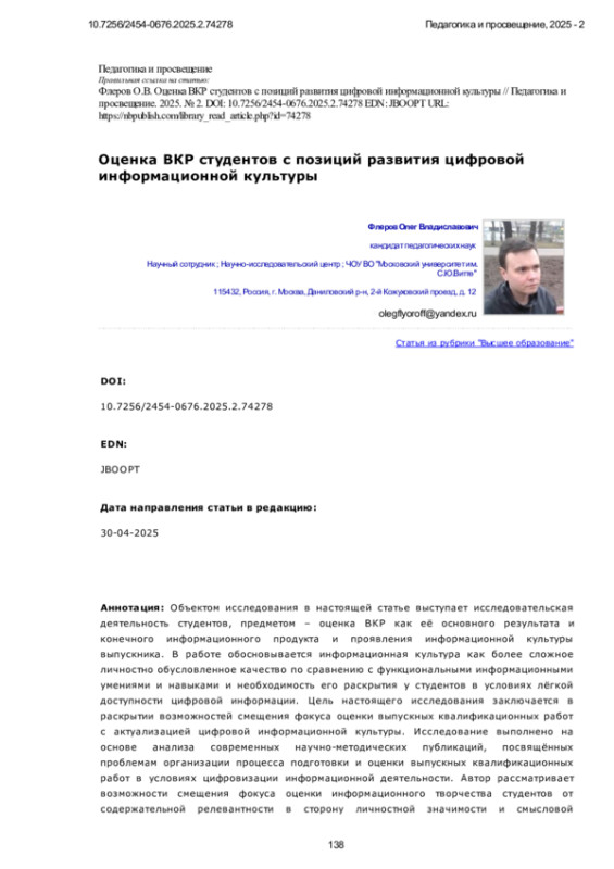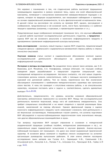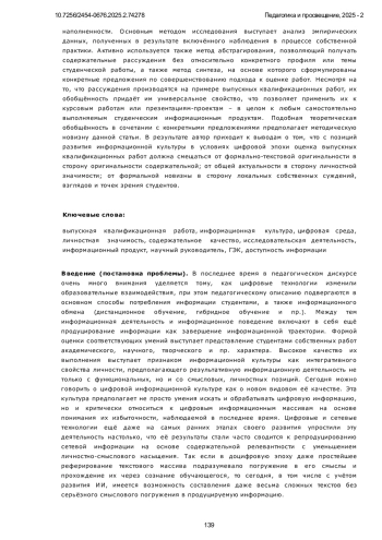 Объектом исследования в настоящей статье выступает исследовательская деятельность студентов, предметом - оценка ВКР как её основного результата и конечного информационного продукта и проявления информационной культуры выпускника. В работе обосновывается информационная культура как более сложное личностно обусловленное качество по сравнению с функциональными информационными умениями и навыками и необходимость его раскрытия у студентов в условиях лёгкой доступности цифровой информации. Цель настоящего исследования заключается в раскрытии возможностей смещения фокуса оценки выпускных квалификационных работ с актуализацией цифровой информационной культуры. Исследование выполнено на основе анализа современных научно-методических публикаций, посвящённых проблемам организации процесса подготовки и оценки выпускных квалификационных работ в условиях цифровизации информационной деятельности. Автор рассматривает возможности смещения фокуса оценки информационного творчества студентов от содержательной релевантности в сторону личностной значимости и смысловой наполненности. Основным методом исследования выступает анализ эмпирических данных, полученных в результате включённого наблюдения в процессе собственной практики. Активно используется также метод абстрагирования, позволяющий получать содержательные рассуждения без относительно конкретного профиля или темы студенческой работы, а также метод синтеза, на основе которого сформулированы конкретные предложения по совершенствованию подхода к оценке работ. Несмотря на то, что рассуждения производятся на примере выпускных квалификационных работ, их обобщённость придаёт им универсальное свойство, что позволяет применить их к курсовым работам или презентациям-проектам - в целом к любым самостоятельно выполняемым студенческим информационным продуктам. Подобная теоретическая обобщённость в сочетании с конкретными предложениями предполагает методическую новизну данной статьи. В результате автор приходит к выводам о том, что с позиций развития информационной культуры в условиях цифровой эпохи оценка выпускных квалификационных работ должна смещаться от формально-текстовой оригинальности в сторону оригинальности содержательной; от общей актуальности в сторону личностной значимости; от формальной новизны в сторону локальных собственных суждений, взглядов и точек зрения студентов.