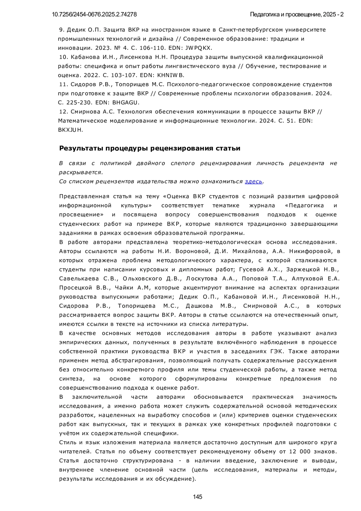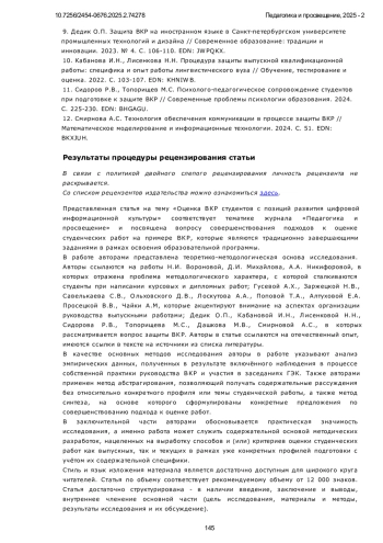 10. Кабанова И.Н., Лисенкова Н.Н. Процедура защиты выпускной квалификационной работы: специфика и опыт работы лингвистического вуза // Обучение, тестирование и оценка. 2022. С. 103-107.