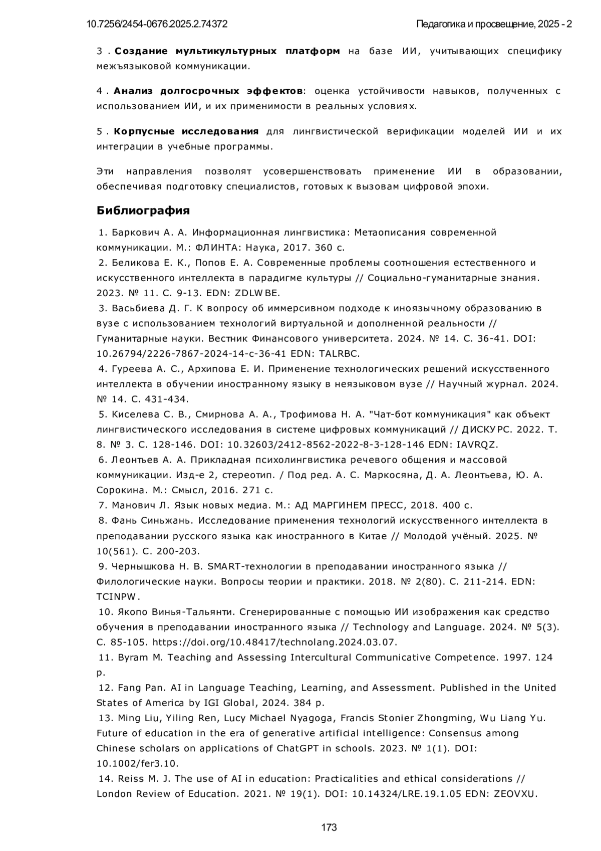 22. 黄欣宁.跨学科视角下人工智能与高校外语教学融合策略研究[J].太原城市职业技术学院学报, 2024, (11):86-88. 10.16227/j.cnki.tycs.2024.0678. (Хуан Синьнин. Стратегии интеграции искусственного интеллекта в преподавании иностранных языков в ВУЗах с междисциплинарной перспективы // Сюэбао Тайюань чэнши чжие цзишу сюэюань (Журнал Тайюаньского городского профессионально-технического института). 2024. № (11). С. 86-88).