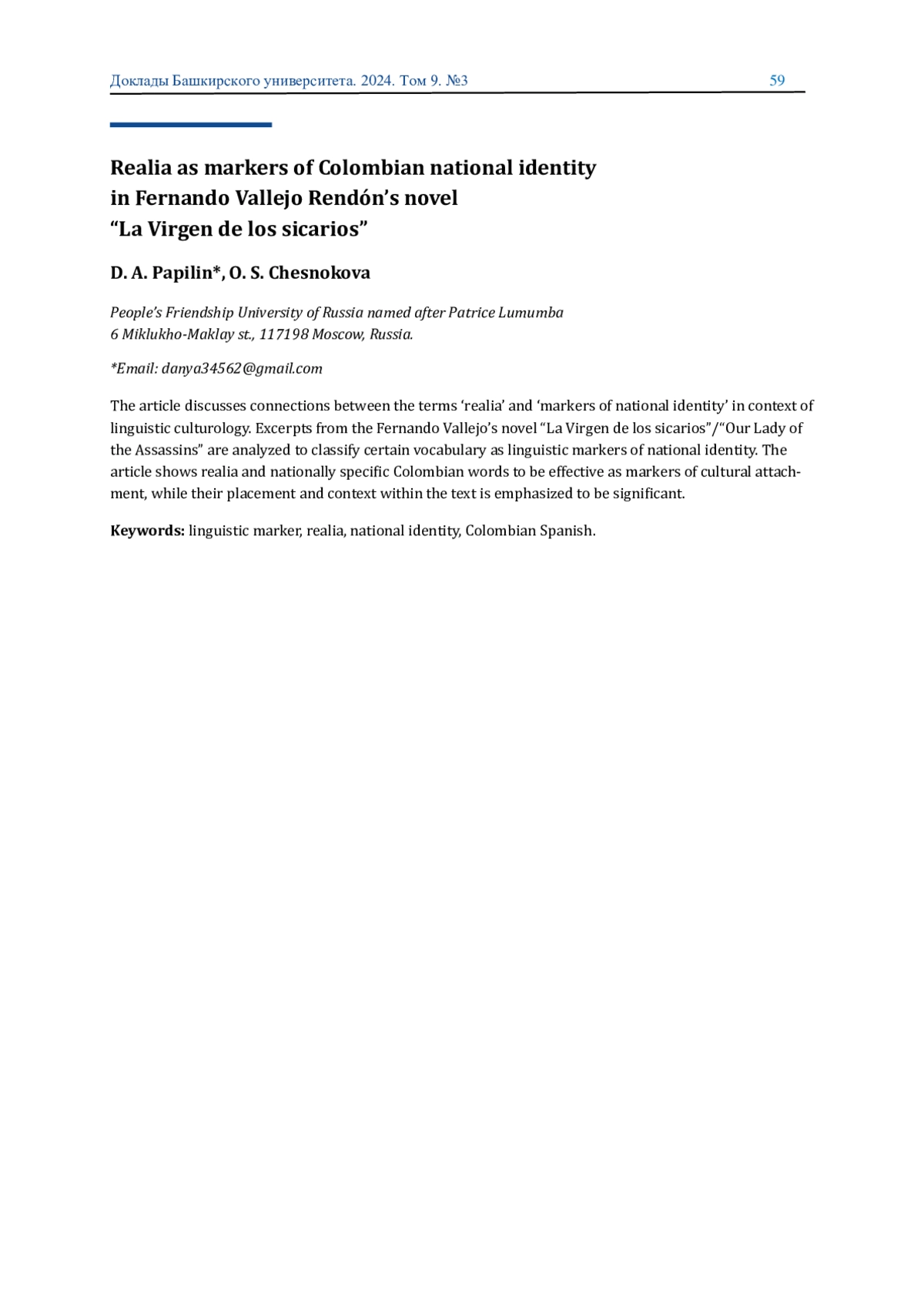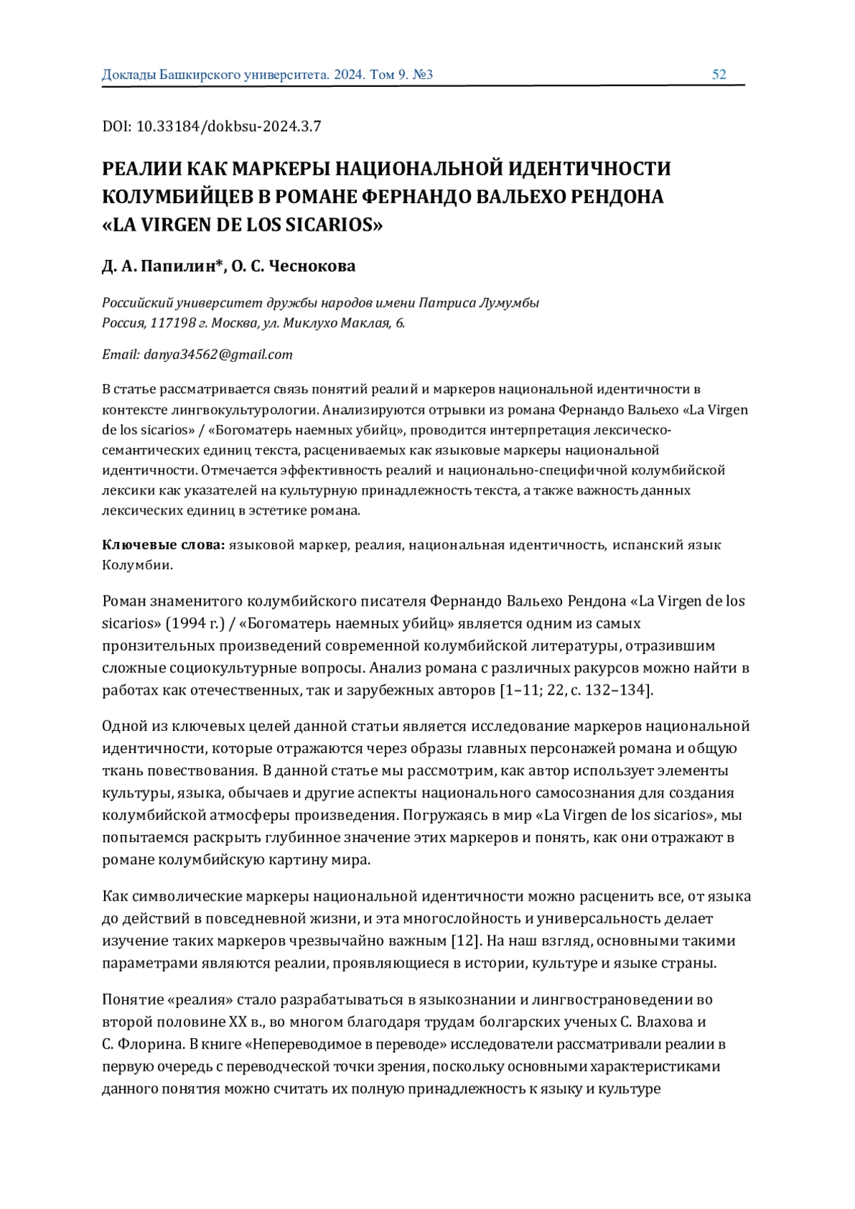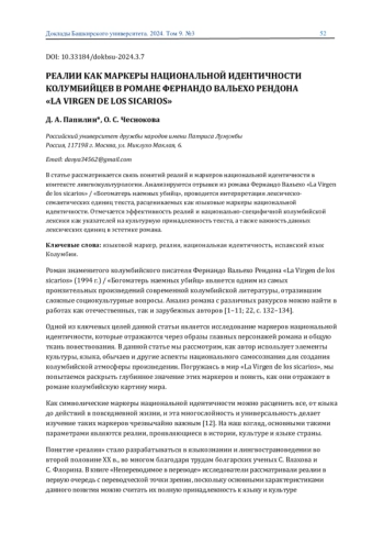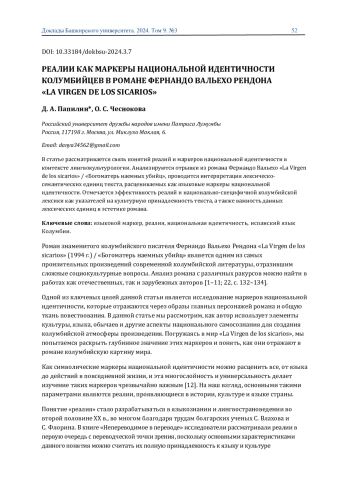 В статье рассматривается связь понятии реалии и маркеров национальной идентичности в контексте лингвокультурологии. Анализируются отрывки из романа Фернандо Вальехо «La Virgen de los sicarios» / «Богоматерь наемных убийц», проводится интерпретация лексическо-семантических единиц текста, расцениваемых как языковые маркеры национальной идентичности. Отмечается эффективность реалии и национально-специфичной колумбийской лексики как указателей на культурную принадлежность текста, а также важность данных лексических единиц в эстетике романа.