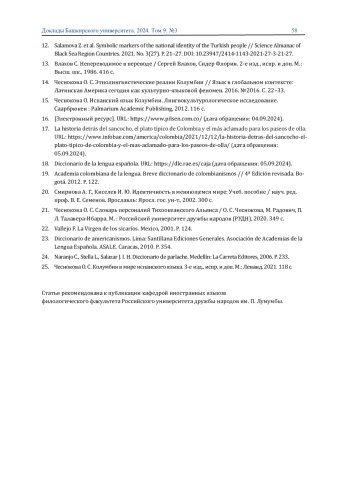 15. Чеснокова О. Испанскии язык Колумбии. Лингвокультурологическое исследование. Саарбрюкен: Palmarium Academic Publishing, 2012. 116 с. [Электронныи ресурс]. URL: https://www.pilsen.com.co/(дата обращения: 04.09.2024). EDN: PGDFEP