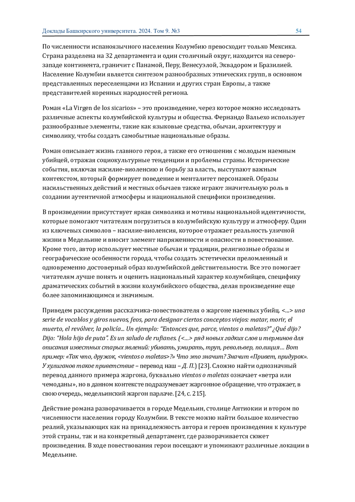 Роман знаменитого колумбии ского писателя Фернандо Вальехо Рендона «La Virgen de los sicarios» (1994 г.) / «Богоматерь наемных убии ц» является одним из самых пронзительных произведении современнои колумбии скои литературы, отразившим сложные социокультурные вопросы. Анализ романа с различных ракурсов можно наи ти в работах как отечественных, так и зарубежных авторов [1–11; 22, с. 132–134].