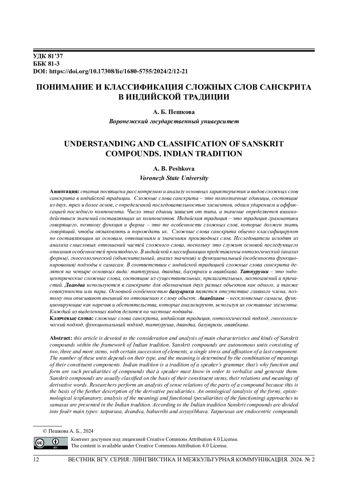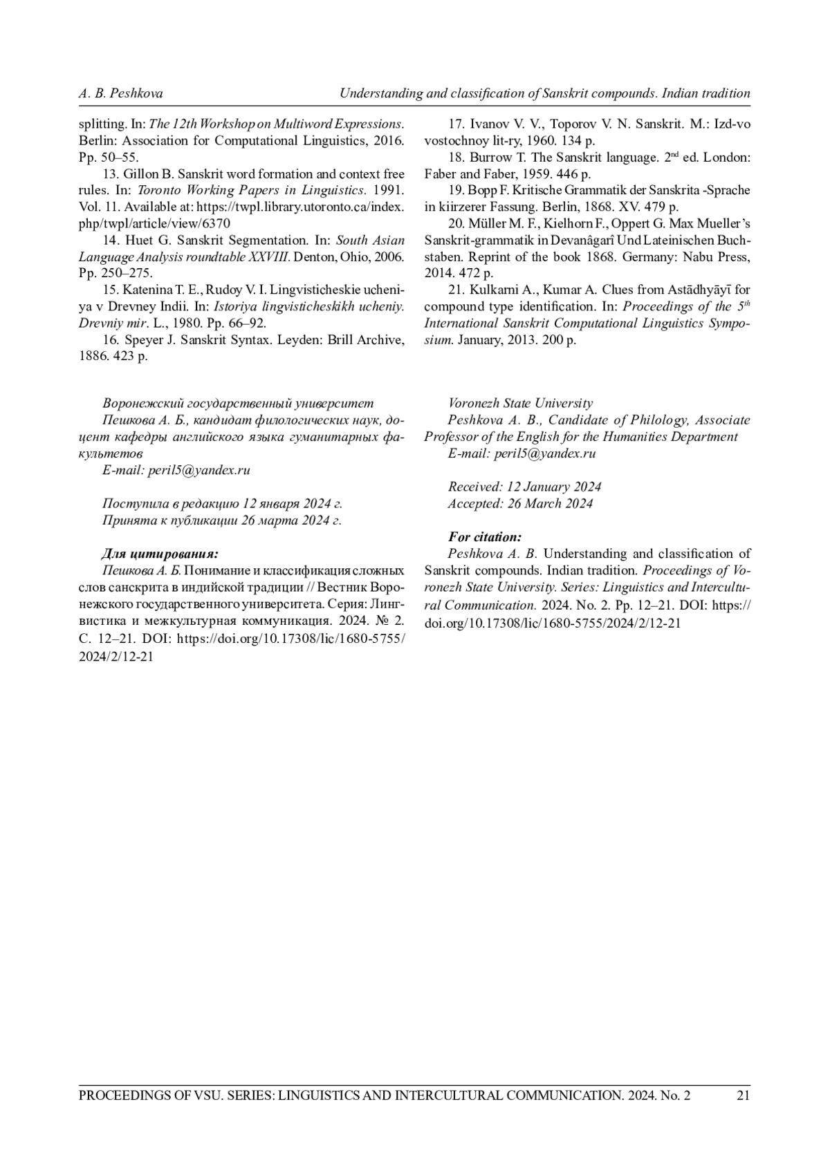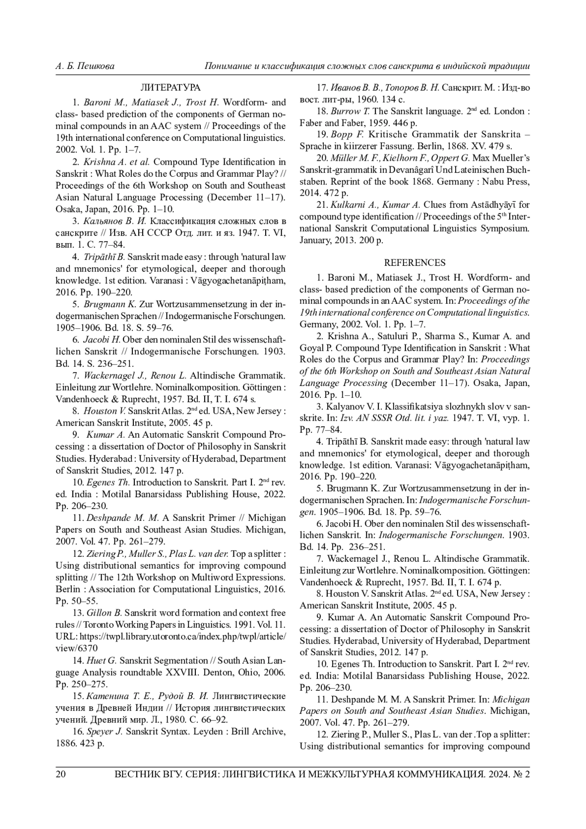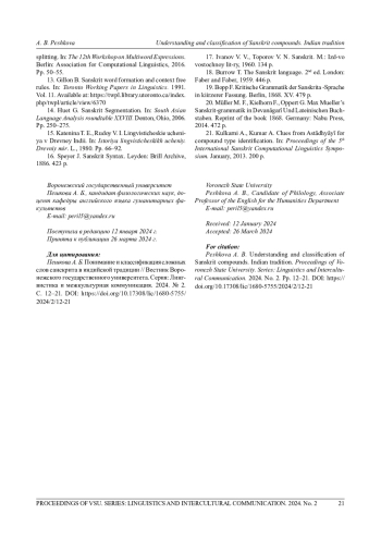 2. Krishna A. et al.Compound Type Identification in Sanskrit: What Roles do the Corpus and Grammar Play? // Proceedings of the 6th Workshop on South and Southeast Asian Natural Language Processing (December 11-17). Osaka, Japan, 2016. Pp. 1-10.