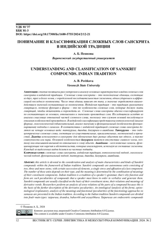 Статья посвящена рассмотрению и анализу основных характеристик и видов сложных слов санскрита в индийской традиции. Сложные слова санскрита - это полнозначные единицы, состоящие из двух, трех и более основ, с определенной последовательностью элементов, одним ударением и аффиксацией последнего компонента. Число этих единиц зависит от типа, а значение определяется взаимодействием значений составляющих их компонентов. Индийская традиция - это традиция грамматики говорящего, поэтому функция и форма - это те особенности сложных слов, которые должен знать говорящий, чтобы оязыковлять и порождать их. Сложные слова санскрита обычно классифицируют по составляющим их основам, отношениям и значениям производных слов. Исследователи исходят из анализа смысловых отношений частей сложного слова, поскольку это служит основой последующего описания особенностей производного. В индийской классификации представлены онтологический (анализ формы), гносеологический (объяснительный, анализ значения) и функциональный (особенности функционирования) подходы к самасам. В соответствии с индийской традицией сложные слова санскрита делятся на четыре основных вида: татпуруша, двандва, бахуврихи и аваябхава. Татпуруши - это эндоцентрические сложные слова, состоящие из существительных, прилагательных, местоимений и причастий. Двандва используются в санскрите для обозначения двух разных объектов как одного, а также совокупности или пары. Основной особенностью бахуврихи является отсутствие главного члена, поэтому они описывают внешний по отношению к слову объект. Аваябхавы - несклоняемые самасы, функционирующие как наречия и обстоятельства, которые анализируют, используя их составные элементы. Каждый из выделенных видов делится на частные подвиды.