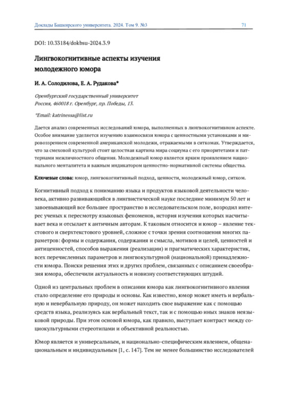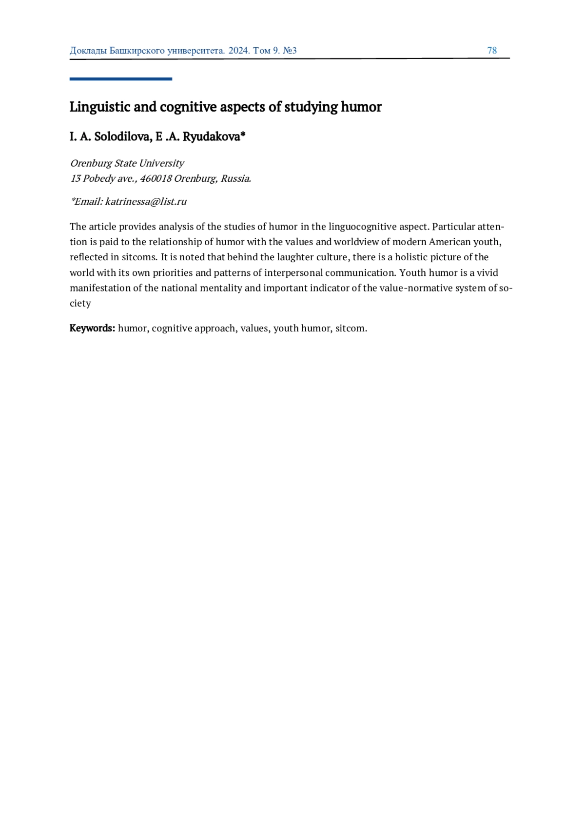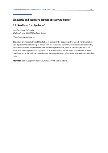 Дается анализ современных исследований юмора, выполненных в лингвокогнитивном аспекте. Особое внимание уделяется изучению взаимосвязи юмора с ценностными установками и мировоззрением современной американской молодежи, отражаемыми в ситкомах. Утверждается, что за смеховой культурой стоит целостная картина мира социума с его приоритетами и паттернами межличностного общения. Молодежный юмор является ярким проявлением национального менталитета и важным индикатором ценностно-нормативной системы общества.