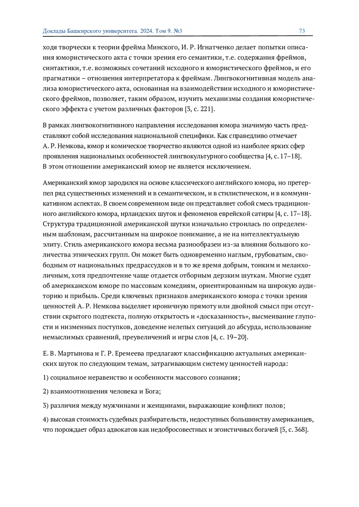 5. 	Мартынова Е. В., Еремеева Г. Р. Лингвистические особенности юмористического дискурса в английском языке // Филологические науки. Вопросы теории и практики. 2018. №6. Ч. 2. С. 367-370. EDN: XQKDET