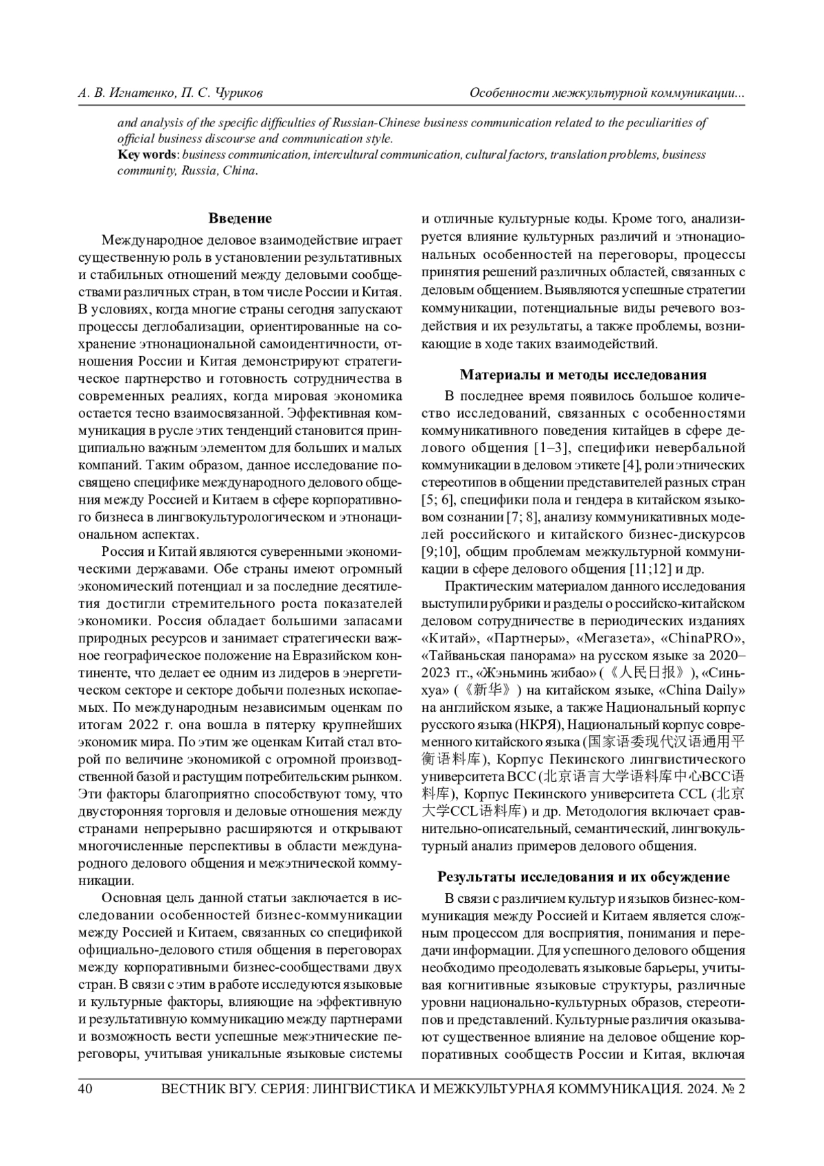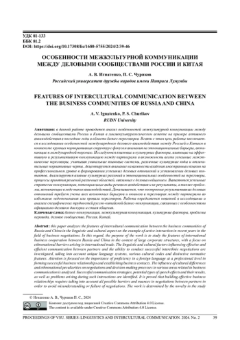 В данной работе проводится анализ особенностей межкультурной коммуникации между деловыми сообществами России и Китая в лингвокультурологическом аспекте на примере активного взаимодействия в последние годы в области бизнес-переговоров. В связи с этим цель работы заключается в исследовании особенностей международного делового взаимодействия между Россией и Китаем в контексте крупных корпоративных структур с фокусом внимания на этнонациональные барьеры, возникающие в международной торговле. Исследуются языковые и культурные факторы, влияющие на эффективную и результативную коммуникацию между партнерами и возможность вести успешные межэтнические переговоры, учитывая уникальные языковые системы, различные культурные коды и отличительные нормативные черты. Акцентируется внимание на важности владения иностранным языком на профессиональном уровне в формировании успешных деловых отношений и установлении деловых контактов. Анализируется влияние культурных различий и этнонациональных особенностей на переговоры, процессы принятия решений различных областей, связанных с деловым общением. Выявляются успешные стратегии коммуникации, потенциальные виды речевого воздействия и их результаты, а также проблемы, возникающие в ходе таких взаимодействий. Доказывается, что построение результативных деловых отношений требует учета всех возможных барьеров и нюансов в переговорах между партнерами во избежание недопонимания или провала переговоров. Работа определяется новизной в исследовании и анализе специфических трудностей русско-китайской бизнес-коммуникации, связанных с особенностями официально-делового дискурса и стиля общения.