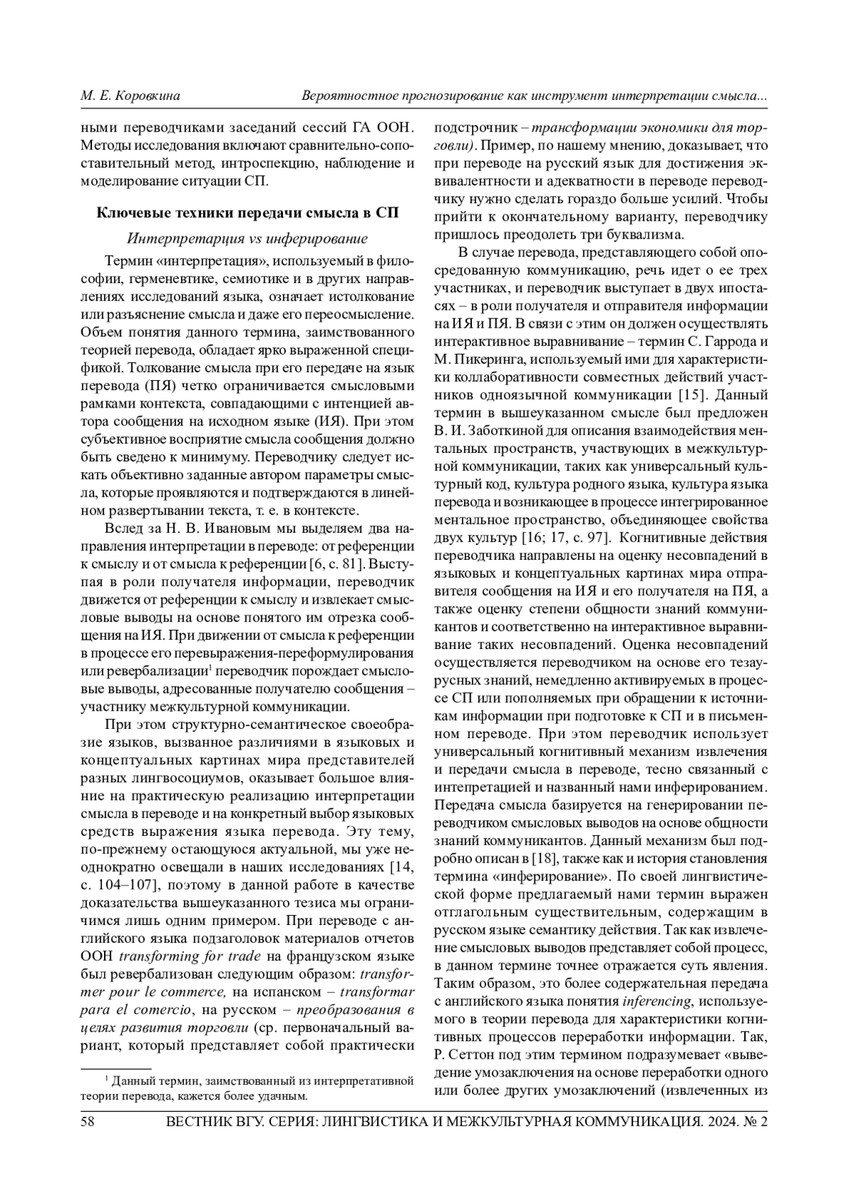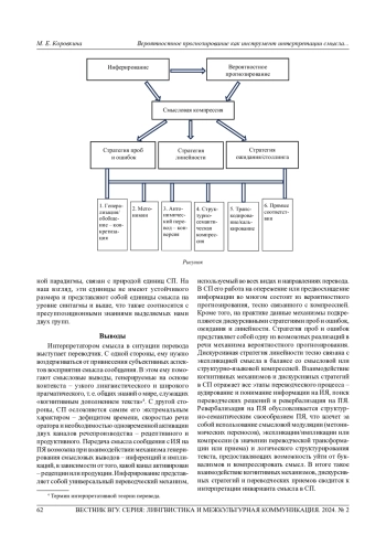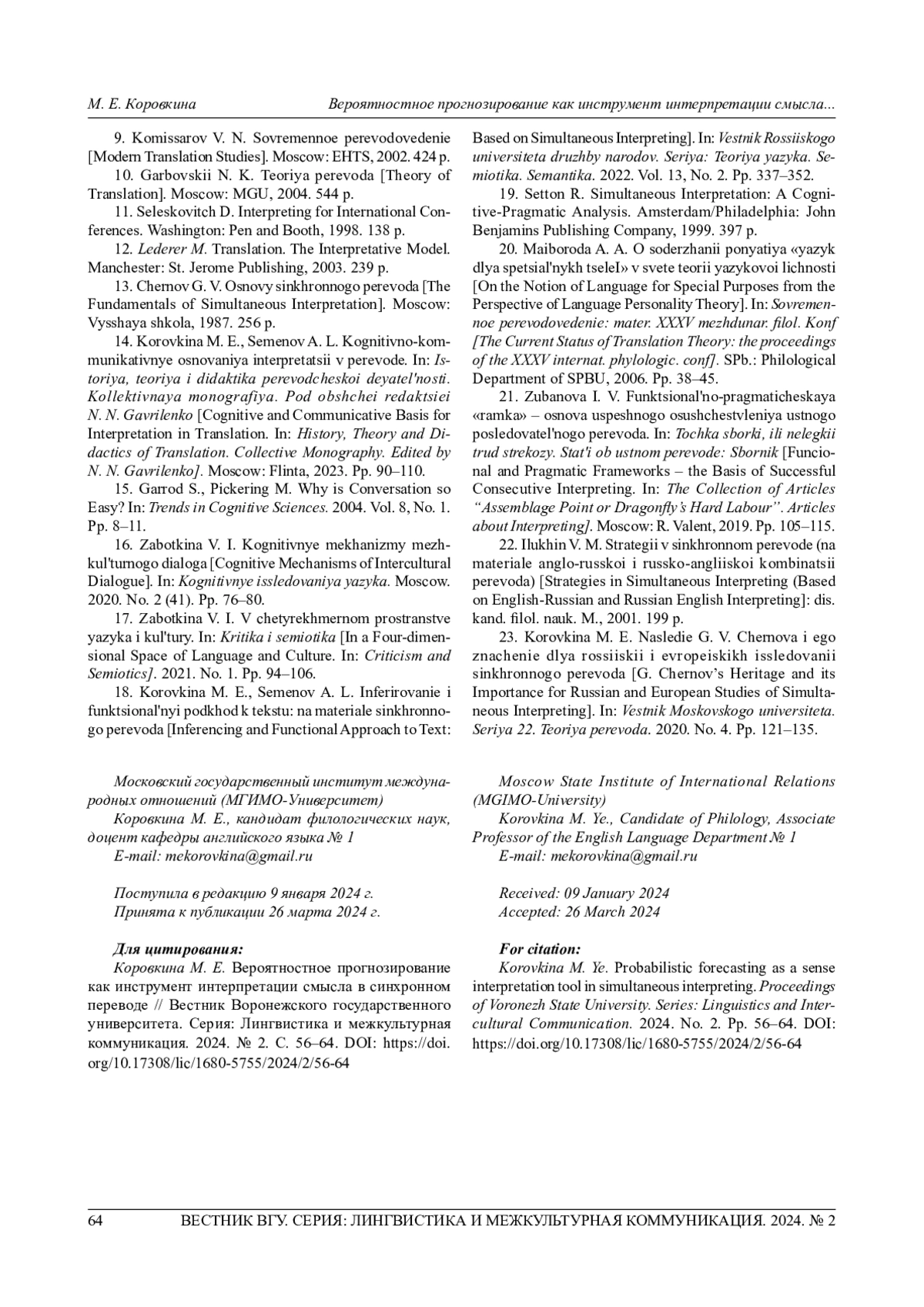 18. 	Коровкина М. Е., Семенов А. Л. Инферирование и функциональный подход к тексту: на материале синхронного перевода // Вестник Рос. ун-та дружбы народов. Сер.: Теория языка. Семиотика. Семантика. 2022. Т. 13, № 2. С. 337-352. EDN: EOKPCO