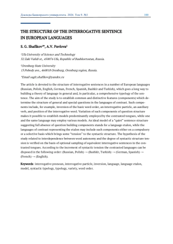 Статья посвящена структуре вопросительного предложения в ряде европейских языков (русском, польском, английском, немецком, французском, итальянском, башкирском, турецком), что имеет важное значение для теории языка в целом и для комплексной типологии предложения в частности. Цель исследования состоит в установлении тождественных и специфических признаков (компонентов), определяющих структуры общего и специального вопросов в языках сравнения. К таким компонентам можно отнести, например, инверсию основного словопорядка, вопросительную частицу, вспомогательный глагол, а также позицию вопросительного местоимения. Варьирование этих компонентов позволяет выделить модели, преимущественно используемые в языках сравнения; при этом один и тот же язык может использовать разные модели. Языком-эталоном служит идеальная модель со «спокойным» строем предложения, т. е. без специальных компонентов построения вопроса, в то время как языки-репрезентанты эталона могут включать такие компоненты в обязательном или выборочном порядке, что приводит к определенной «напряженности» синтаксической структуры. Гипотеза исследования, которая рассматривает зависимость позиционной автономности слова от степени напряженности синтаксического строя, проверяется с помощью произвольной выборки эквивалентных вопросительных предложений в языках сравнения. По степени возрастания синтаксической напряженности языки сравнения можно расположить в следующей последовательности: (русский, польский) → (башкирский, турецкий) → (немецкий, испанский) → (французский) → (английский).