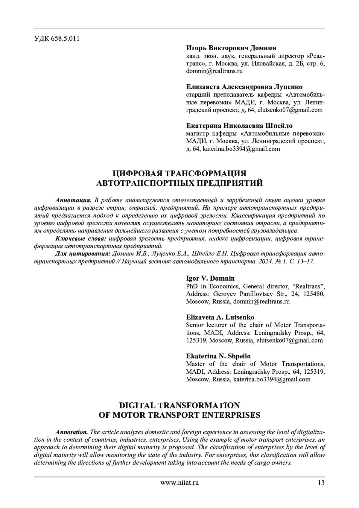 ДОМНИН И. В., ЛУЦЕНКО Е. А., ШПЕЙЛО Е. Н. ЦИФРОВАЯ ТРАНСФОРМАЦИЯ АВТОТРАНСПОРТНЫХ ПРЕДПРИЯТИЙ // НАУЧНЫЙ ВЕСТНИК АВТОМОБИЛЬНОГО ТРАНСПОРТА. 2024. № 1
