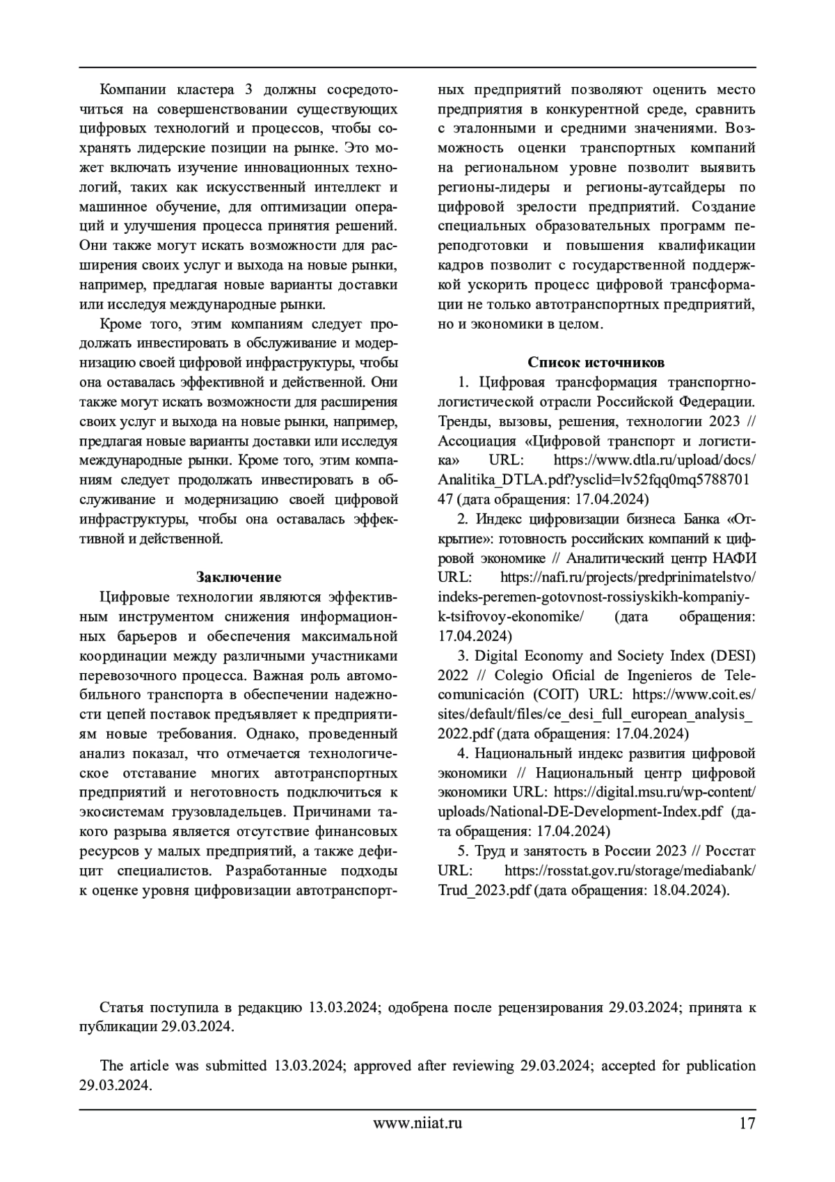 Статья: ЦИФРОВАЯ ТРАНСФОРМАЦИЯ АВТОТРАНСПОРТНЫХ ПРЕДПРИЯТИЙ (2024)