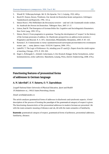 В статье анализируются грамматические формы обращения в диахронном и синхронном аспектах. Дается краткое описание процесса формирования парадигмы грамматической категории респективности. Представлена характеристика функционирования в современном немецком языке прономинальных обращений: Sie с основным семантическим значением дистанцированности и du, ihr с основной семантикой фамильярности.
