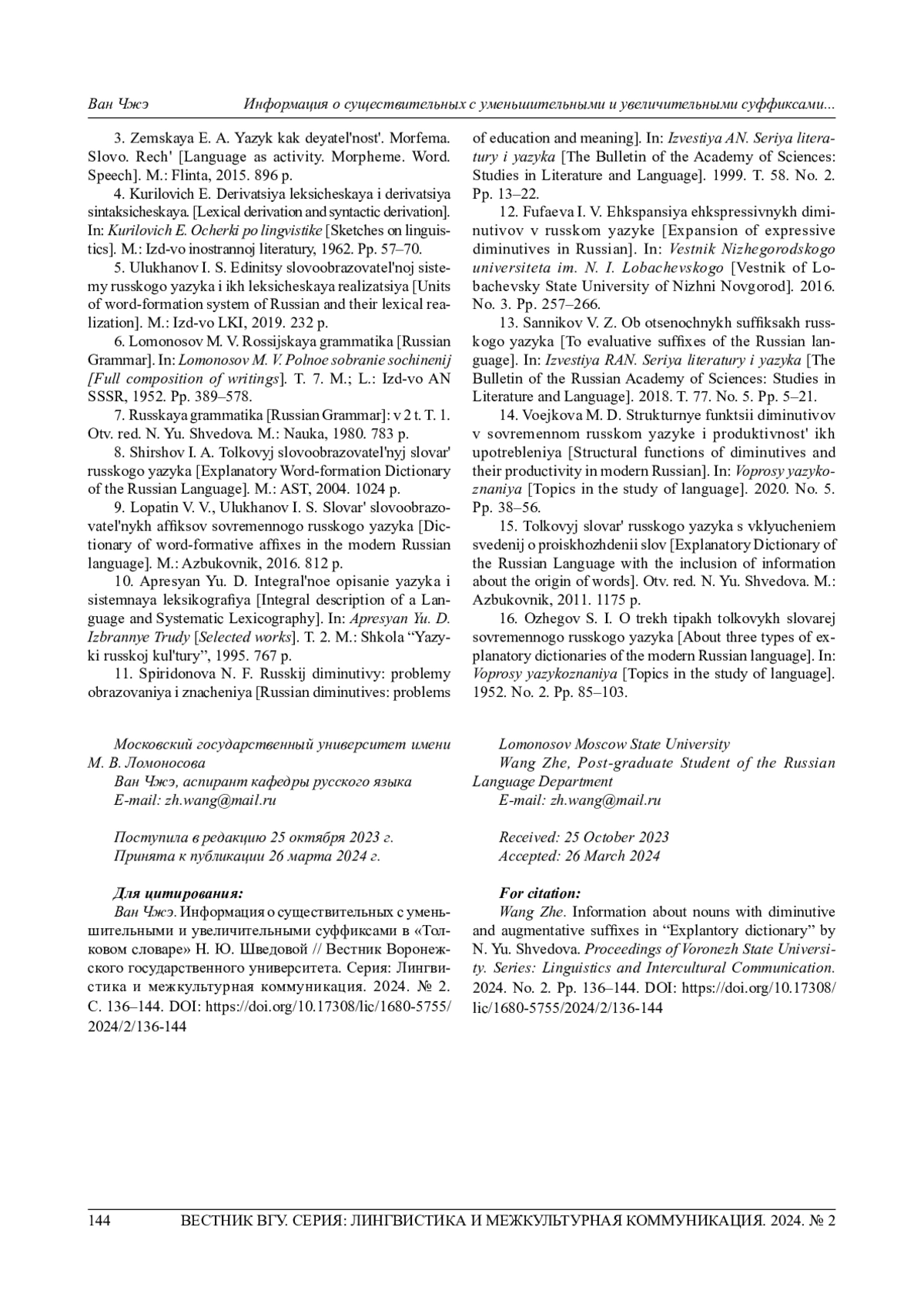 14. Воейкова М. Д. Структурные функции диминутивов в современном русском языке и продуктивность их употребления // Вопросы языкознания. 2020. № 5. С. 38-56. EDN: JTUPKA