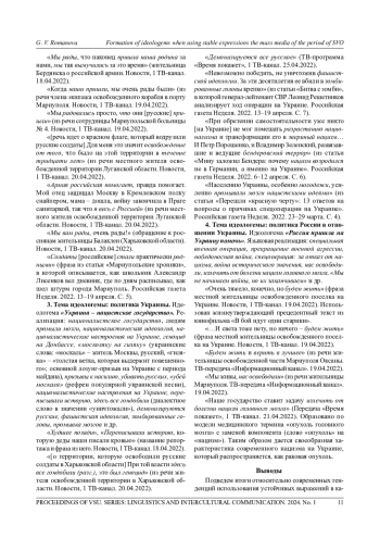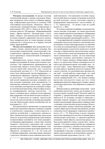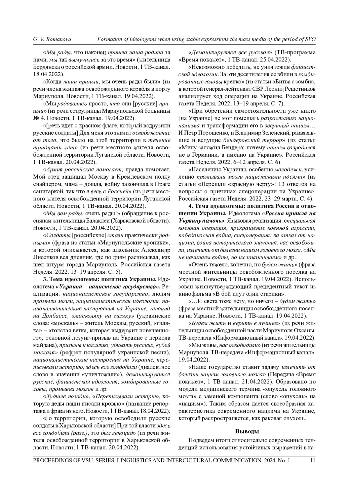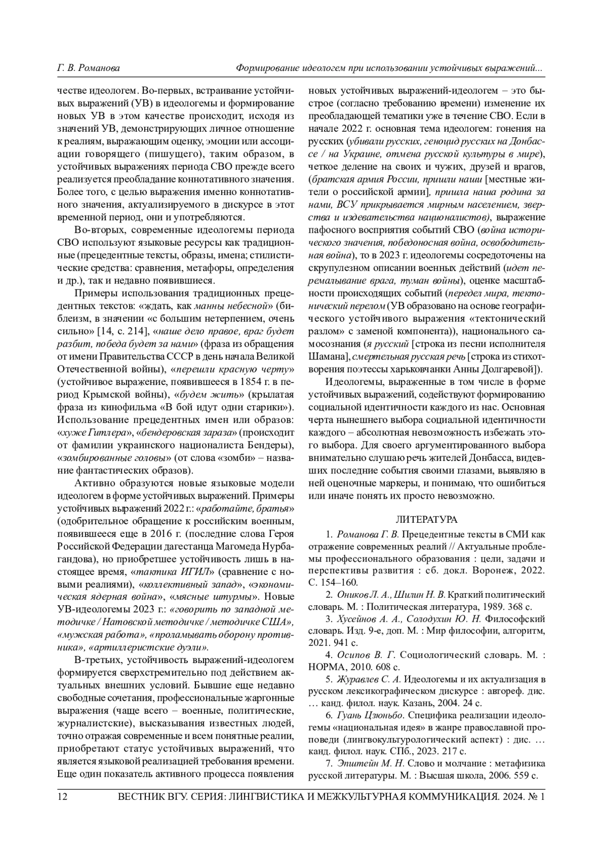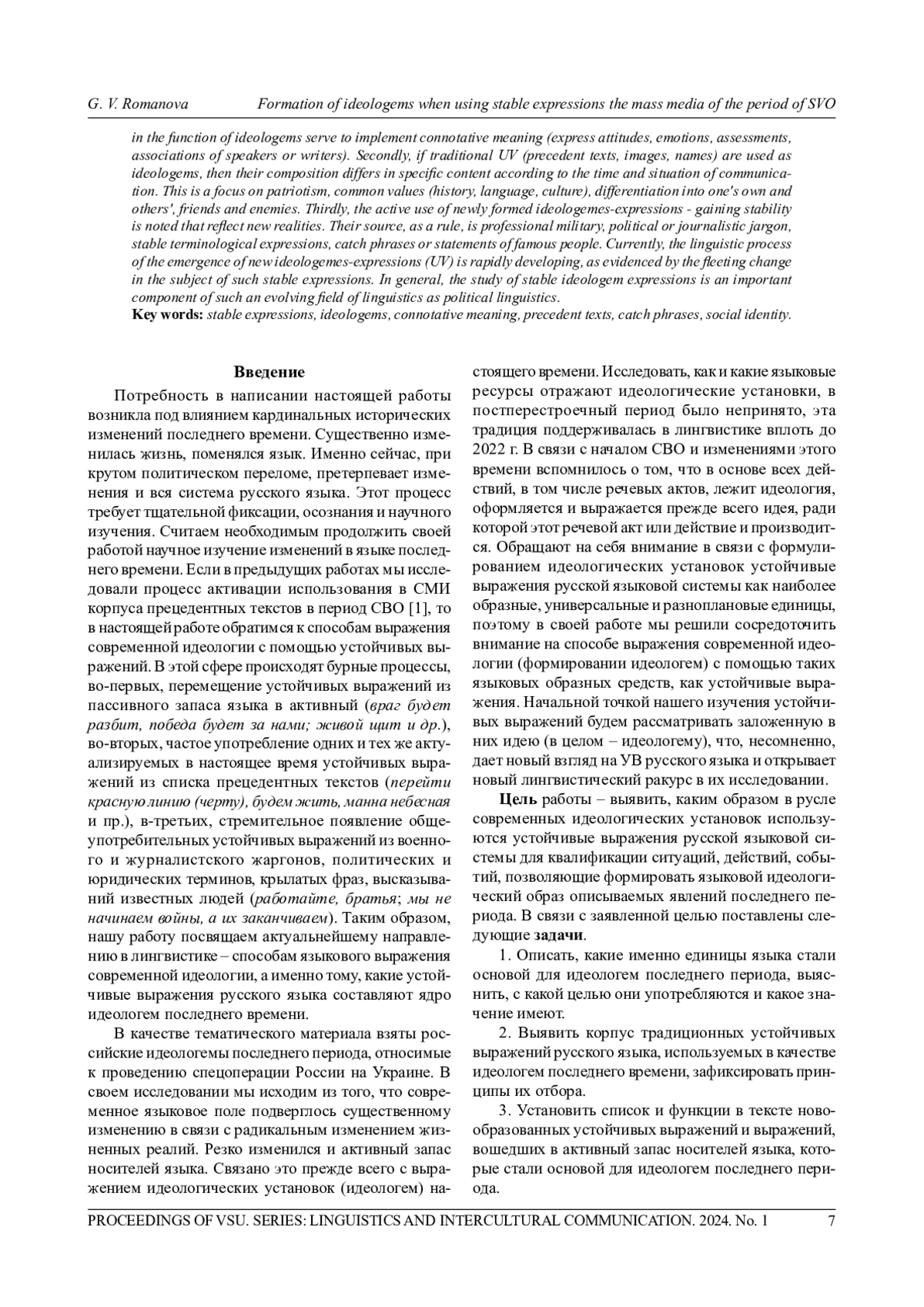 Статья посвящена вопросу языкового оформления идеологем, возникших в период проведения Россией специальной военной операции (СВО). Предметом изучения стали устойчивые выражения (УВ), послужившие основой для идеологем. Исследование проведено с целью установления принципов отбора, возникновения и использования устойчивых выражений периода СВО, выполняющих функцию идеологем. В процессе работы выявлен массив идеологем из массмедийного и политического дискурса, установлен их состав и проведено лингвистическое описание, выполнен этимологический и стилистический анализ устойчивых выражений-идеологем. При исследовании сделаны следующие выводы: во-первых, устойчивые выражения в функции идеологем служат для реализации коннотативного значения (выражают отношение, эмоции, оценки, ассоциации говорящих или пишущих). Во-вторых, если в качестве идеологем используются традиционные УВ (прецедентные тексты, образы, имена), то их состав отличается специфическим содержанием сообразно времени и ситуации общения. Это направленность на патриотизм, общие ценности (историю, язык, культуру), разграничение на своих и чужих, друзей и врагов. В-третьих, отмечено активное использование приобретающих устойчивость новообразованных идеологем-выражений, отражающих новые реалии. Их источником, как правило, становится профессиональный военный, политический или журналистский жаргон, устойчивые терминологические выражения, крылатые фразы или высказывания известных людей. В настоящее время языковой процесс появления новых идеологем-выражений (УВ) стремительно развивается, о чем свидетельствует быстротечное изменение их тематики. В целом изучение устойчивых выражений-идеологем является важной составной частью такой эволюционирующей в настоящее время области языкознания, как политическая лингвистика.