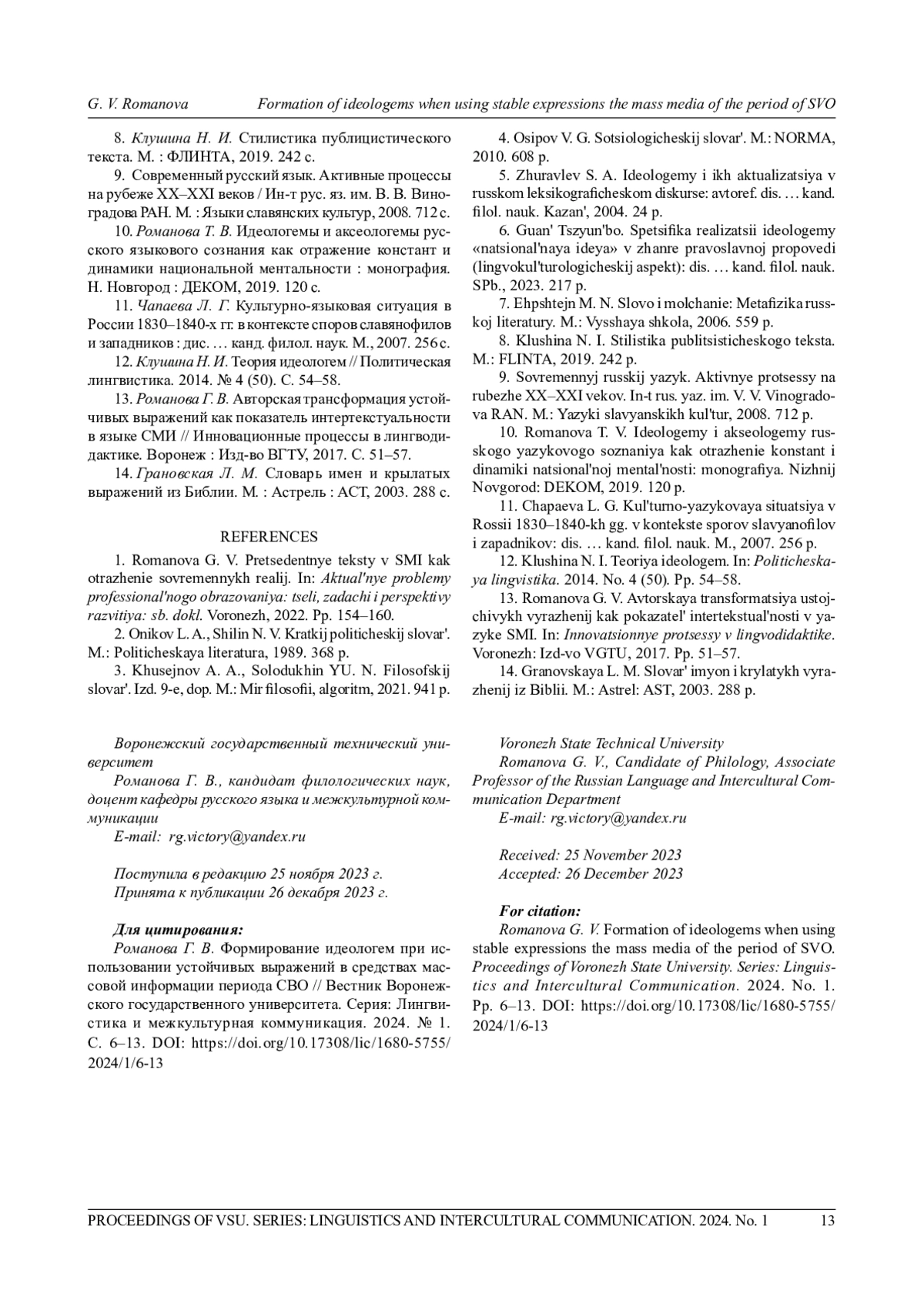 13. 	Романова Г. В. Авторская трансформация устойчивых выражений как показатель интертекстуальности в языке СМИ // Инновационные процессы в лингводидактике. Воронеж: Изд-во ВГТУ, 2017. С. 51-57. EDN: YQNUPY