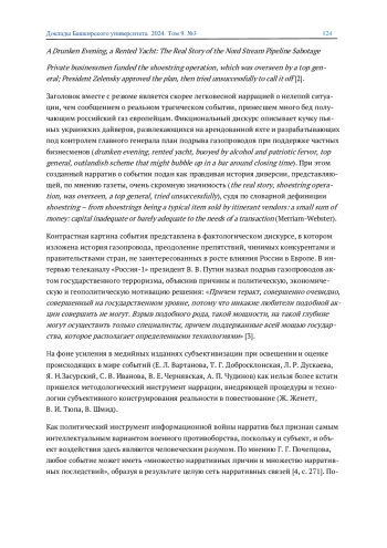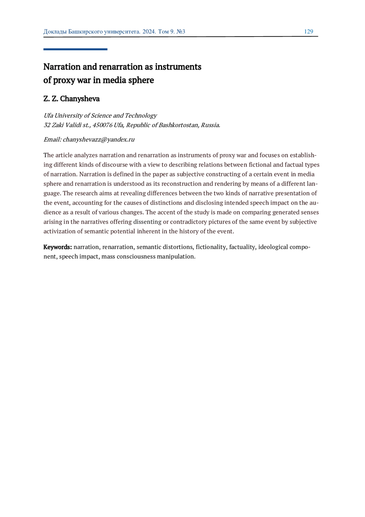 Статья посвящена анализу наррации и ренаррации как инструментов прокси-войны и исследованию различных видов нарративного дискурса для установления отношений между факциональным и фактуальным типами. Наррация определяется как субъективное конструирование в медиасфере определенного события, а ренаррация как восстановление наррации и ее передача средствами другого языка. Цель работы состоит в установлении расхождений в двух видах нарративного освещения события, объяснении их причин и вскрытии преследуемых в результате изменений целей. Фокус внимания сконцентрирован на сопоставлении порождаемых дискурсивных смыслов в случаях неоднозначного освещения события за счет активизации заложенного в истории события смыслового потенциала.