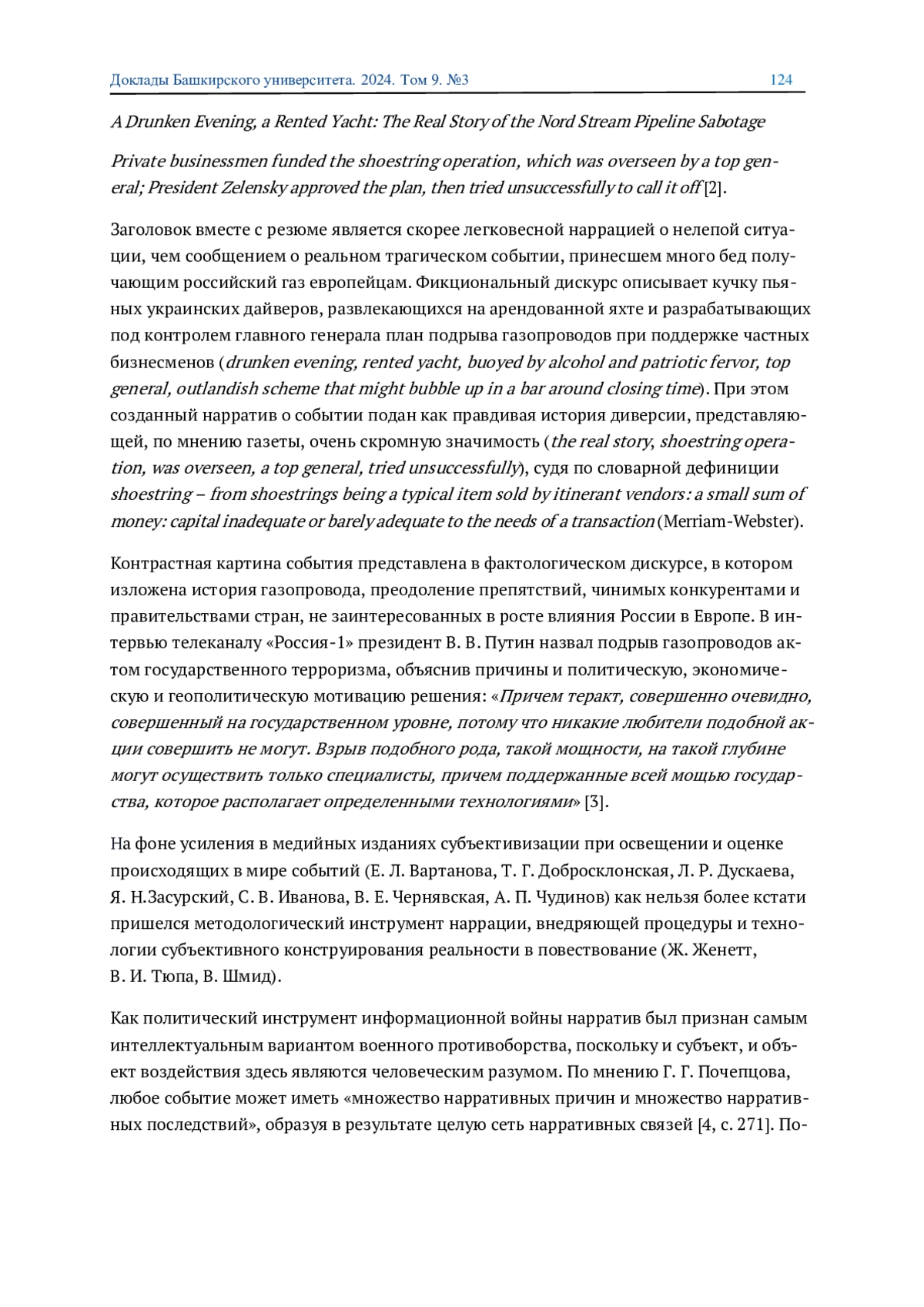 2. 	Pancevski B. A Drunken Evening, a Rented Yacht: The Real Story of the Nord Stream Pipeline Sabotage. URL: www.wsj.comeurope/nord-stream-pipeline-explosion-real-story-da24839c (date of access: 08.09.2024).