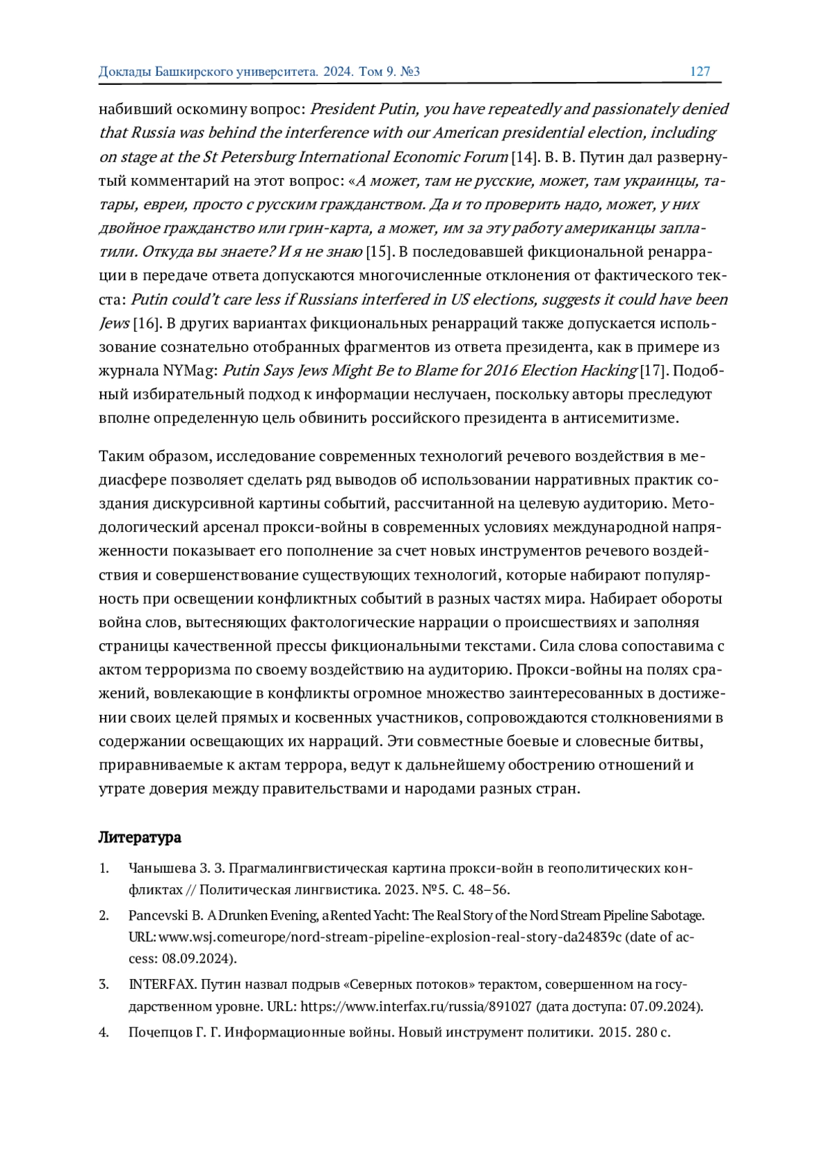 1. 	Чанышева З. З. Прагмалингвистическая картина прокси-войн в геополитических конфликтах // Политическая лингвистика. 2023. №5. С. 48-56. EDN: UJIRAG