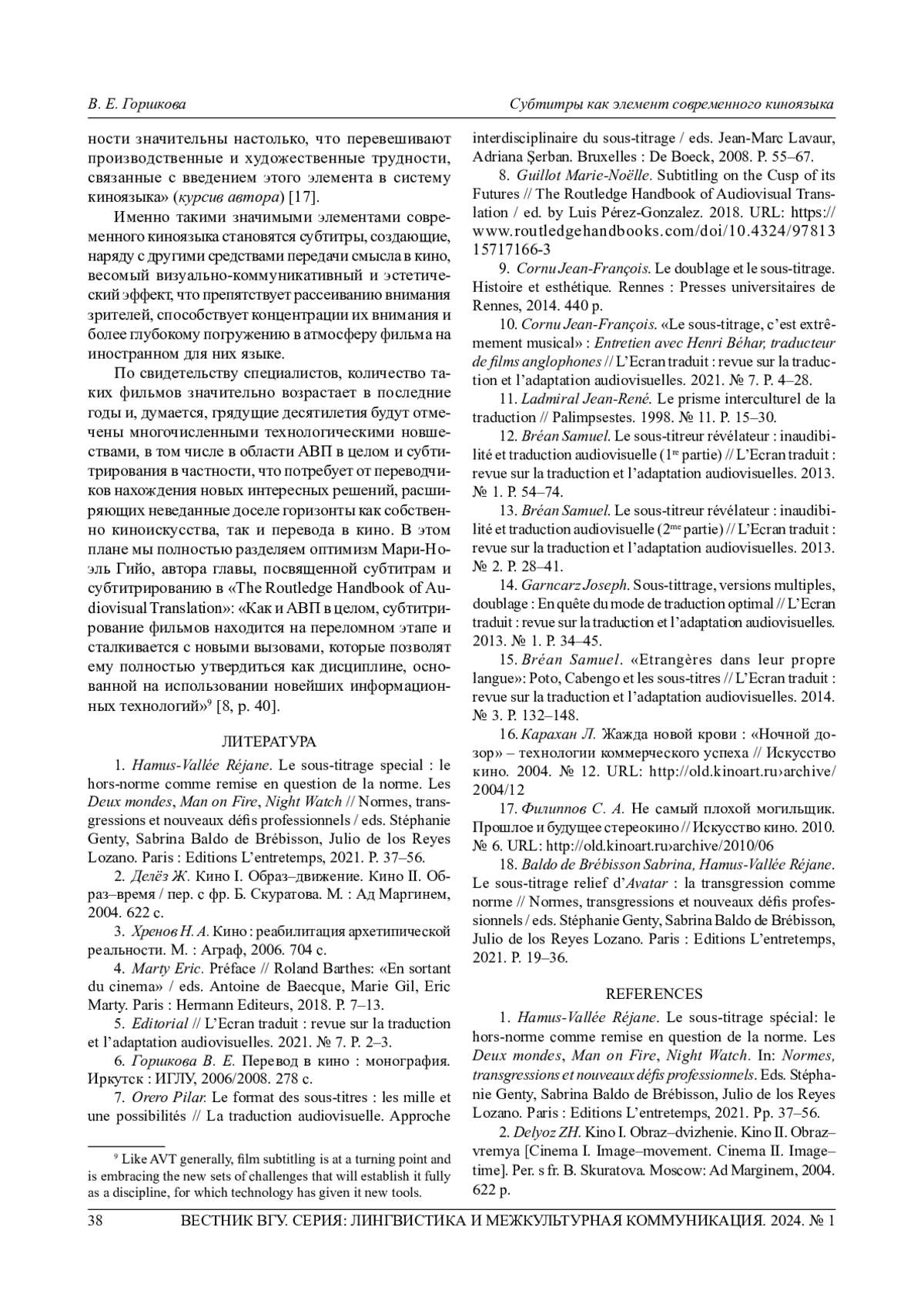 10. 	Cornu Jean-Frangois. “Le sous-titrage, c’est extre-mement musical”: Entretien avec Henri Behar, traducteur de films anglophones // L’Ecran traduit: revue sur la traduction et l’adaptation audiovisuelles. 2021. № 7. P. 4-28.