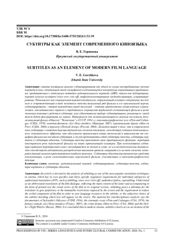 6. 	Горшкова В. Е. Перевод в кино: монография. Иркутск: ИГЛУ, 2006/2008. 278 с. EDN: RUFWTL