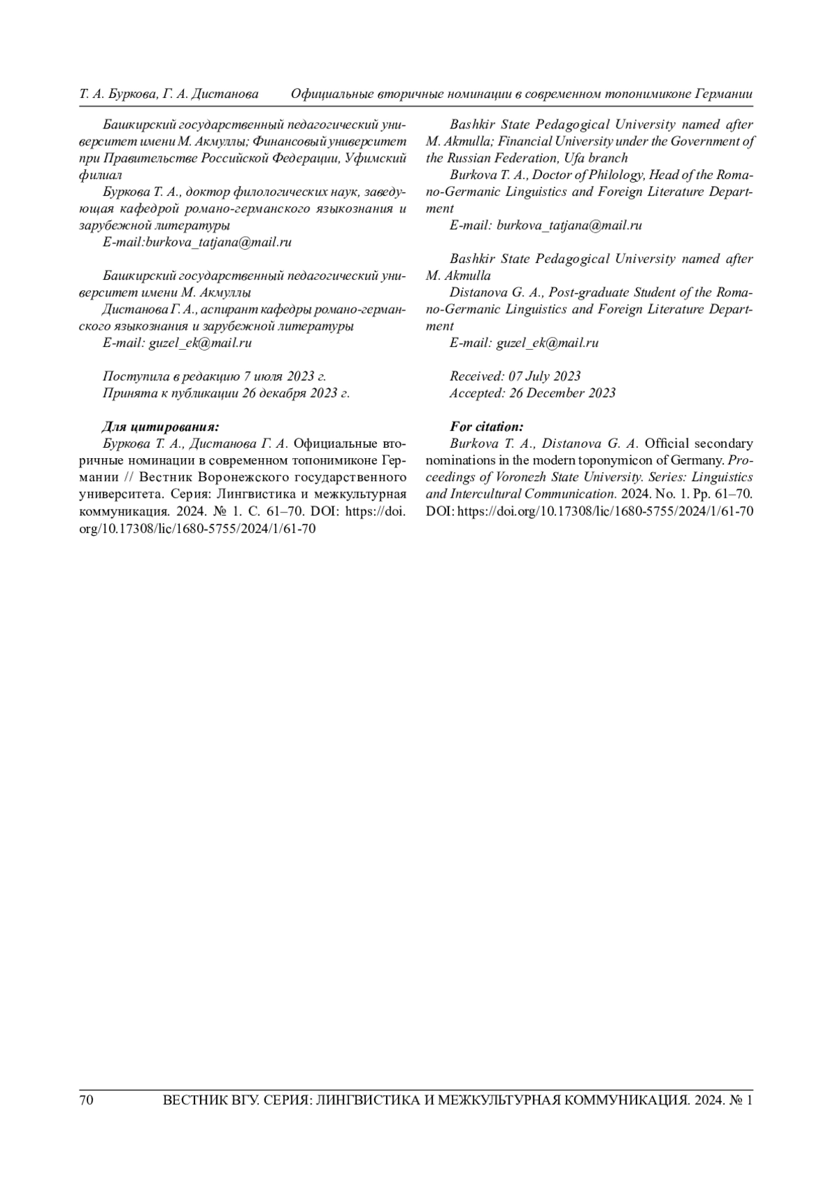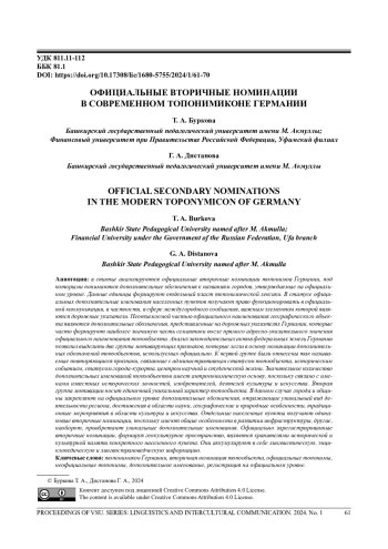 В статье анализируются официальные вторичные номинации топонимов Германии, под которыми понимаются дополнительные обозначения к названиям городов, утверждаемые на официальном уровне. Данные единицы формируют отдельный пласт топонимической лексики. В статусе официальных дополнительные именования населенных пунктов получают право функционировать в официальной коммуникации, в частности, в сфере междугородного сообщения, важным элементом которой являются дорожные указатели. Неотъемлемой частью официального наименования географического объекта являются дополнительные обозначения, представленные на дорожных указателях Германии, которые часто формируют наиболее значимую часть семантики после прямого адресно-указательного значения официального наименования топообъекта. Анализ законодательных актов федеральных земель Германии позволил выделить две группы мотивирующих признаков, которые легли в основу номинации дополнительных обозначений топообъектов, используемых официально. К первой группе были отнесены так называемые повторяющиеся признаки, связанные с административным статусом топообъекта, историческим событием, статусом города-курорта, центром научной и студенческой жизни. Значительное количество дополнительных именований топообъектов имеет антропонимическую основу, поскольку связано с именами известных исторических личностей, изобретателей, деятелей культуры и искусства. Вторая группа мотивации носит единичный уникальный характер топообъекта. В данном случае города и общины закрепляют на официальном уровне дополнительные обозначения, отражающие уникальный вид деятельности региона, достижения в области науки, географические и природные особенности, традиционные мероприятия в области культуры и искусства. Отдельные населенные пункты получают одинаковые вторичные номинации, поскольку имеют общие особенности в развитии инфраструктуры, другие, наоборот, приобретают уникальные дополнительные именования. Официально зарегистрированные вторичные номинации, формируя геокультурное пространство, являются хранителями исторической и культурной памяти конкретного населенного пункта. Они аккумулируют в себе лингвистическую, энциклопедическую и лингвострановедческую информацию.
