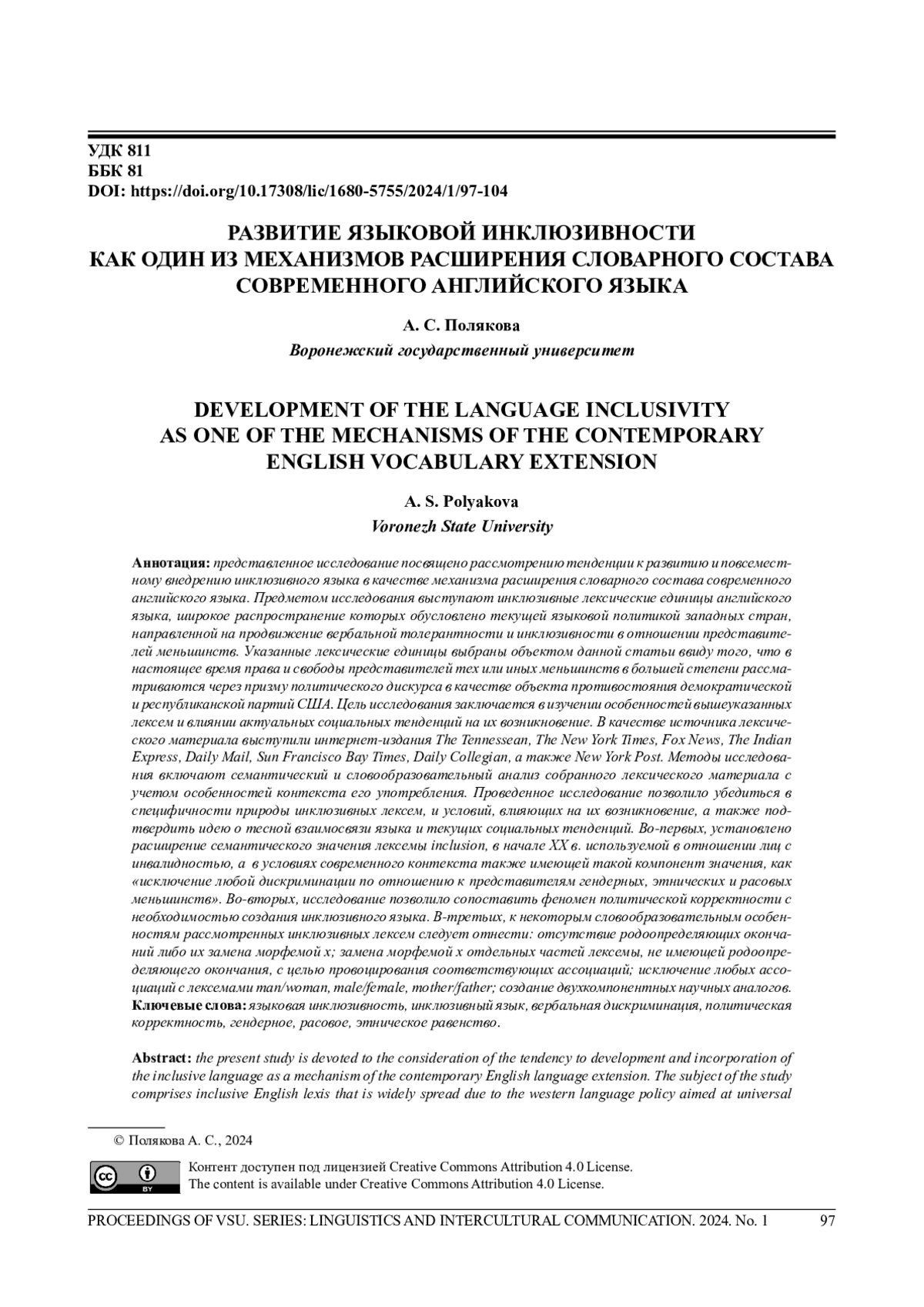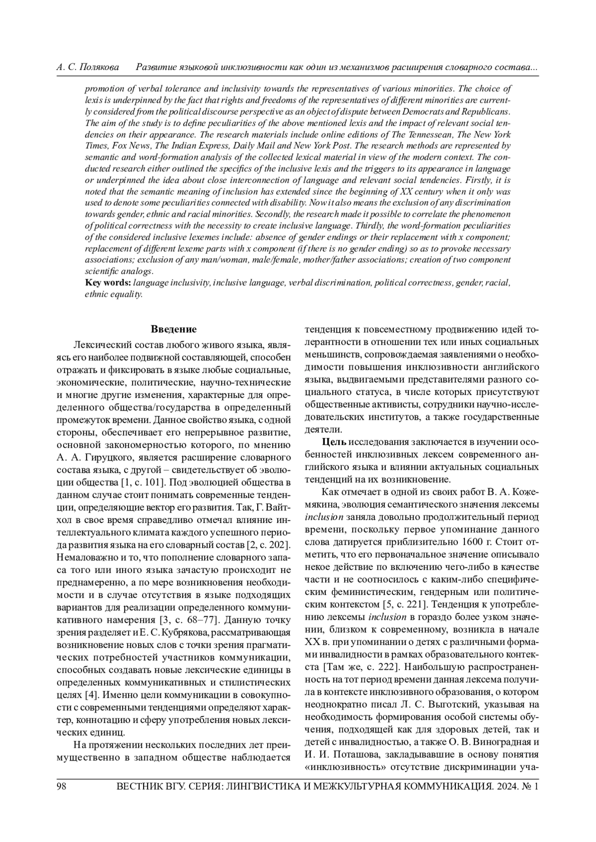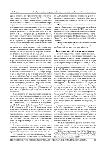Представленное исследование посвящено рассмотрению тенденции к развитию и повсеместному внедрению инклюзивного языка в качестве механизма расширения словарного состава современного английского языка. Предметом исследования выступают инклюзивные лексические единицы английского языка, широкое распространение которых обусловлено текущей языковой политикой западных стран, направленной на продвижение вербальной толерантности и инклюзивности в отношении представителей меньшинств. Указанные лексические единицы выбраны объектом данной статьи ввиду того, что в настоящее время права и свободы представителей тех или иных меньшинств в большей степени рассматриваются через призму политического дискурса в качестве объекта противостояния демократической и республиканской партий США. Цель исследования заключается в изучении особенностей вышеуказанных лексем и влиянии актуальных социальных тенденций на их возникновение. В качестве источника лексического материала выступили интернет-издания The Tennessean, The New York Times, Fox News, The Indian Express, Daily Mail, Sun Francisco Bay Times, Daily Collegian, а также New York Post. Методы исследования включают семантический и словообразовательный анализ собранного лексического материала с учетом особенностей контекста его употребления. Проведенное исследование позволило убедиться в специфичности природы инклюзивных лексем, и условий, влияющих на их возникновение, а также подтвердить идею о тесной взаимосвязи языка и текущих социальных тенденций. Во-первых, установлено расширение семантического значения лексемы inclusion, в начале ХХ в. используемой в отношении лиц с инвалидностью, а в условиях современного контекста также имеющей такой компонент значения, как «исключение любой дискриминации по отношению к представителям гендерных, этнических и расовых меньшинств». Во-вторых, исследование позволило сопоставить феномен политической корректности с необходимостью создания инклюзивного языка. В-третьих, к некоторым словообразовательным особенностям рассмотренных инклюзивных лексем следует отнести: отсутствие родоопределяющих окончаний либо их замена морфемой х; замена морфемой х отдельных частей лексемы, не имеющей родоопределяющего окончания, с целью провоцирования соответствующих ассоциаций; исключение любых ассоциаций с лексемами man/woman, male/female, mother/father; создание двухкомпонентных научных аналогов