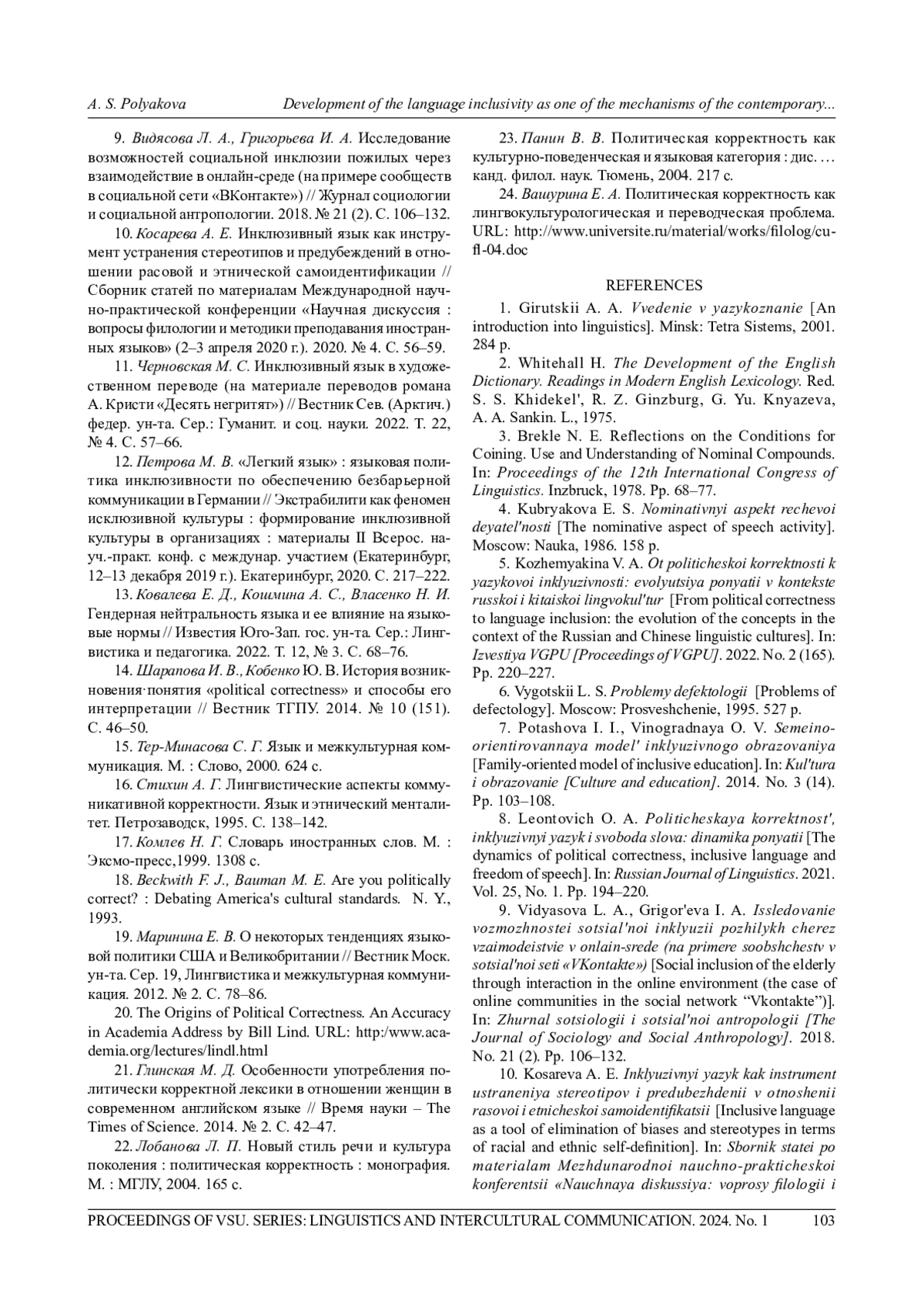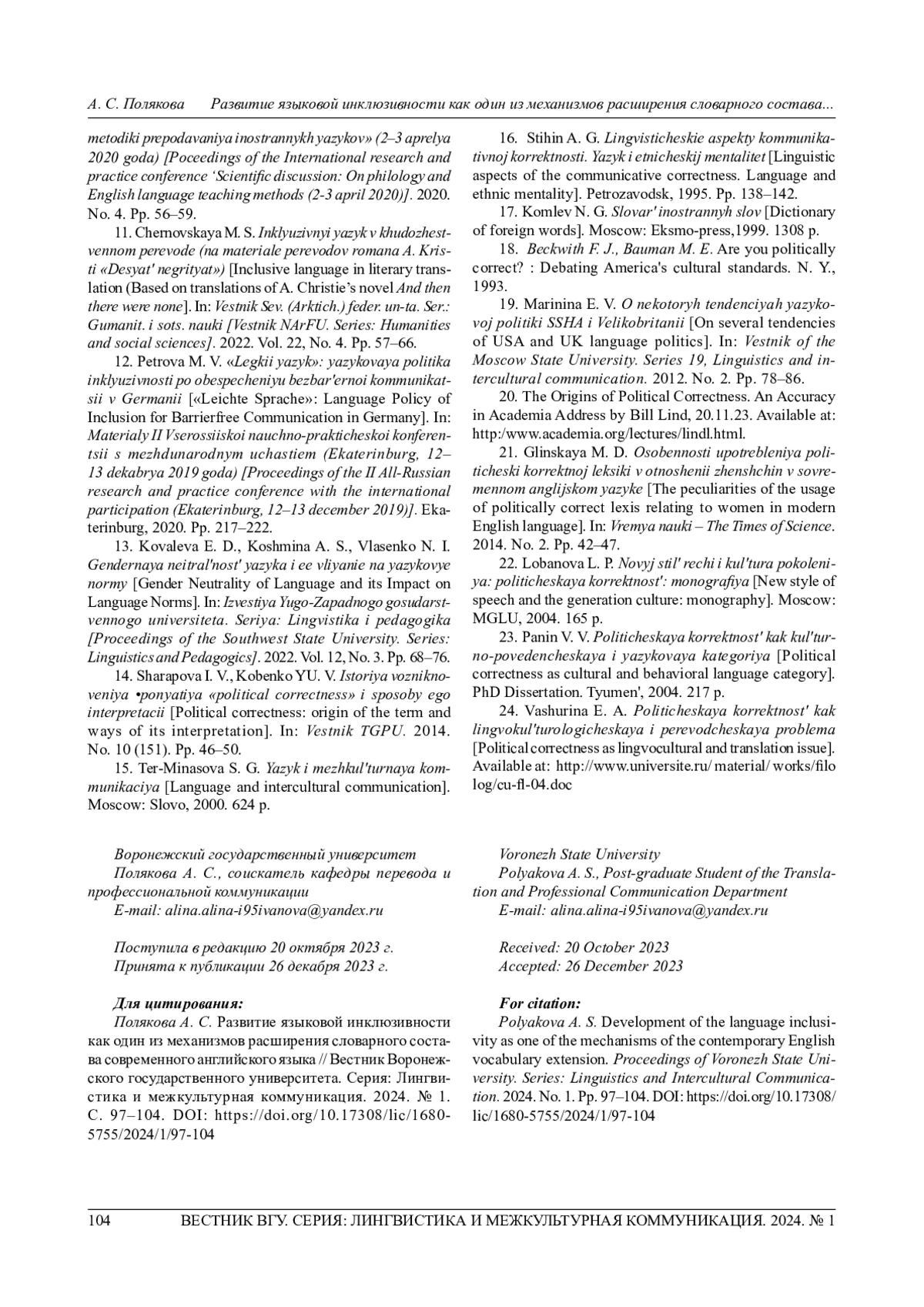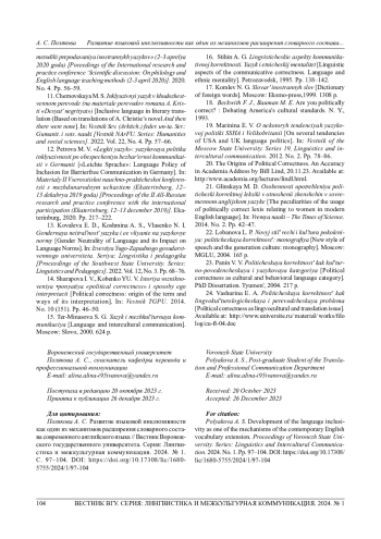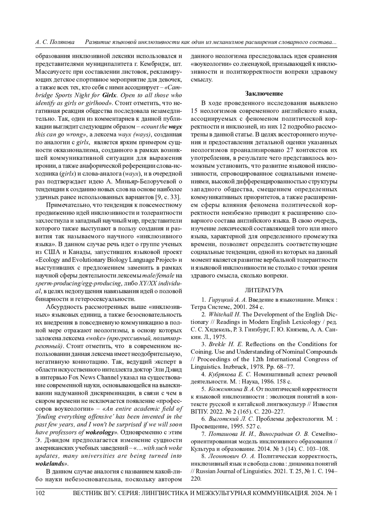 8. 	Леонтович О. А. Политическая корректность, инклюзивный язык и свобода слова: динамика понятий // Russian Journal of Linguistics. 2021. Т. 25, № 1. С. 194220. EDN: KMJJWZ
