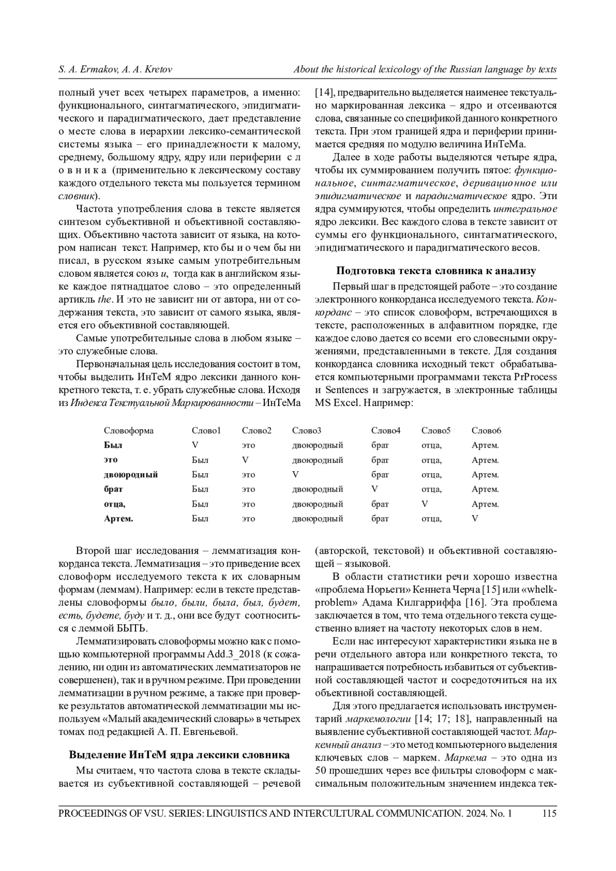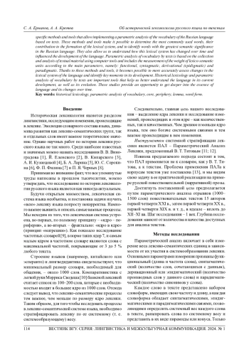 Историческая лексикология является важной областью, которая помогает понять процессы, происходящие в языке. В рамках данного исследования проводится эксперимент по системной стратификации лексики текста, который направлен на изучение истории лексическо-семантической системы русского языка. Целью эксперимента является анализ того, какие слова входят в ядро лексики языка, а какие являются периферийными. В статье предлагаются конкретные методы и инструменты, которые позволяют провести параметрический анализ лексики русского языка на основе текстов. Эти методы и инструменты позволяют определить наиболее употребляемые слова, их вклад в формирование лексической системы и выделить слова с наибольшей семантической значимостью в русском языке. Также они позволяют понять, как эта лексическая система менялась со временем и влияла на развитие языка. Параметрический анализ лексики по текстам основан на сборе и анализе текстового материала при помощи компьютерных инструментов и включает в себя измерение веса лексико-семантических единиц по основным параметрам, а именно: функциональному, синтагматическому, деривационному (эпидигматическому) и парадигматическому. Благодаря этим методам и инструментам становится возможным более точно оценить изменения в лексической системе языка и выделить ключевые моменты развития. Историческая лексикология и параметрический анализ лексики по текстам являются важными инструментами, которые помогают лучше понять язык в его текущем развитии, а также его эволюцию. Эти исследования дают возможность глубже проникнуть в суть языка и его изменений со временем.