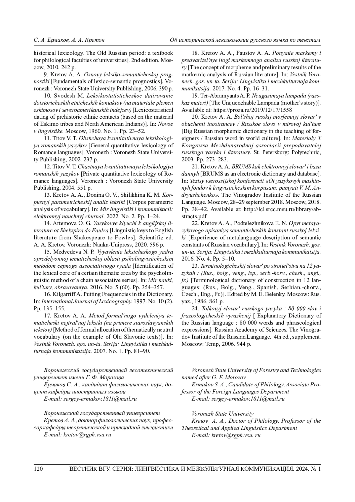 17. 	Кретов А. А. Метод формального выделения тематически нейтральной лексики (на примере старославянских текстов) // Вестник Воронеж. гос. ун-та. Сер.: Лингвистика и межкультурная коммуникация. 2007. № 1. С. 81-90. EDN: KVMNKD