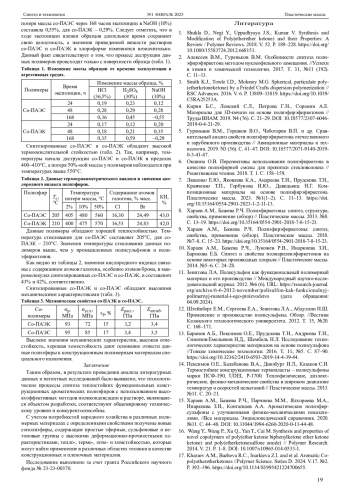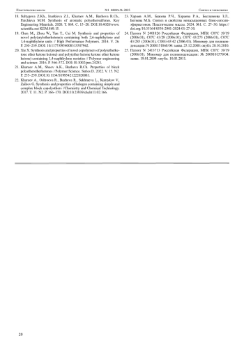 21. 	Kharaev A.M., Shaov A.K., Bazheva R.Ch. Properties of block polyetheretherketones //Polymer Science. Series D. 2022. V. 15. N2. P. 255-259. DOI: 10.1134/S1995421222020083