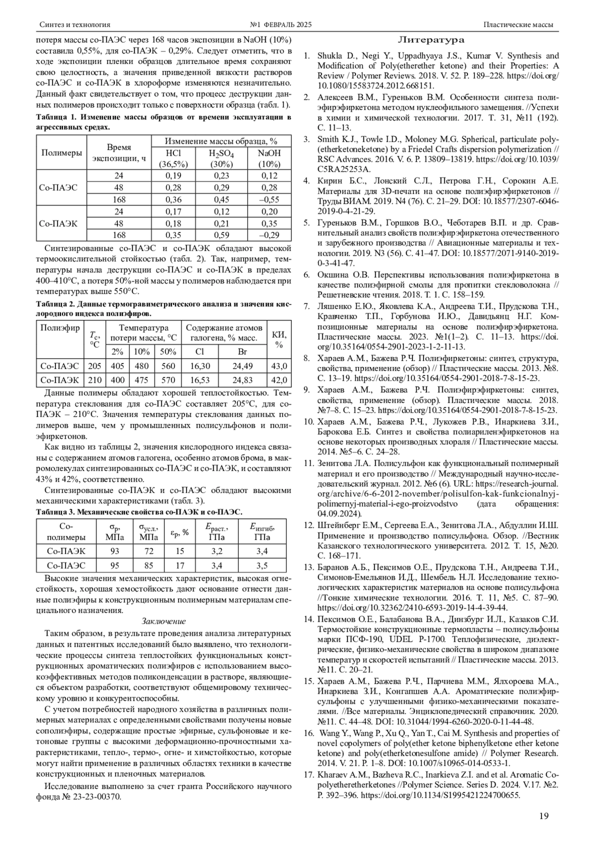 1. 	Shukla D., Negi Y., Uppadhyaya J.S., Kumar V. Synthesis and Modifi cation of Poly(etherether ketone) and their Properties: A Review / Polymer Reviews. 2018. V. 52. Р. 189-228. DOI: 10.1080/15583724.2012.668151
