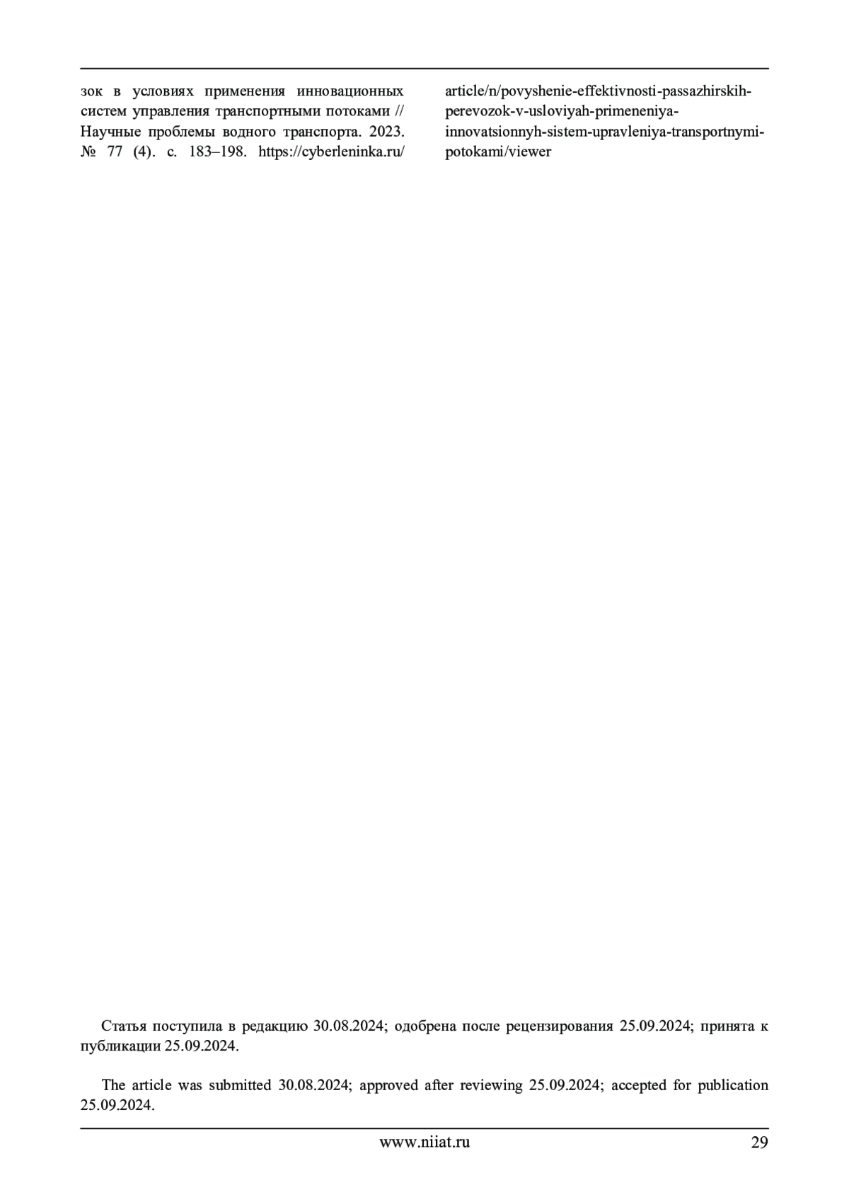10. Пумбрасова Н.В., Упадышаева Е.В. Повышение эффективности пассажирских перевозок в условиях применения инновационных систем управления транспортными потоками // Научные проблемы водного транспорта. 2023. № 77 (4). с. 183–198. https://cyberleninka.ru/ article/n/povyshenie-effektivnosti-passazhirskihperevozok- v-usloviyah-primeneniyainnovatsionnyh- sistem-upravleniya-transportnymipotokami/ viewer