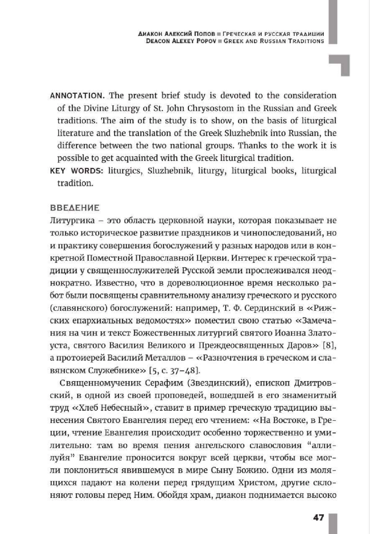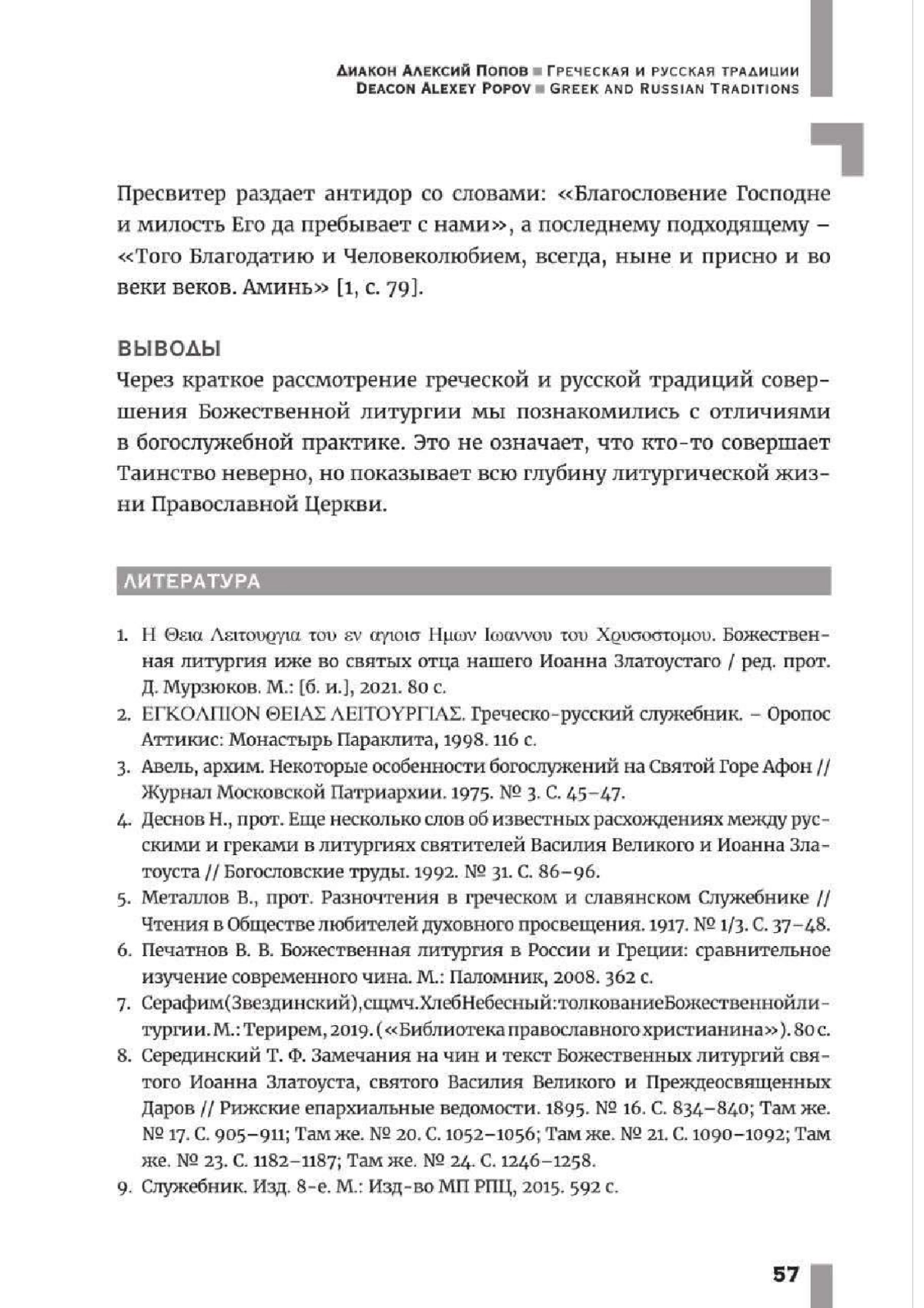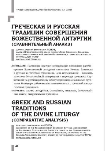Попов А.Д., диак. Греческая и русская традиции совершения Божественной литургии: сравнительный анализ // Труды Таврической духовной семинарии. - 2024. - №1. - С.46-58.