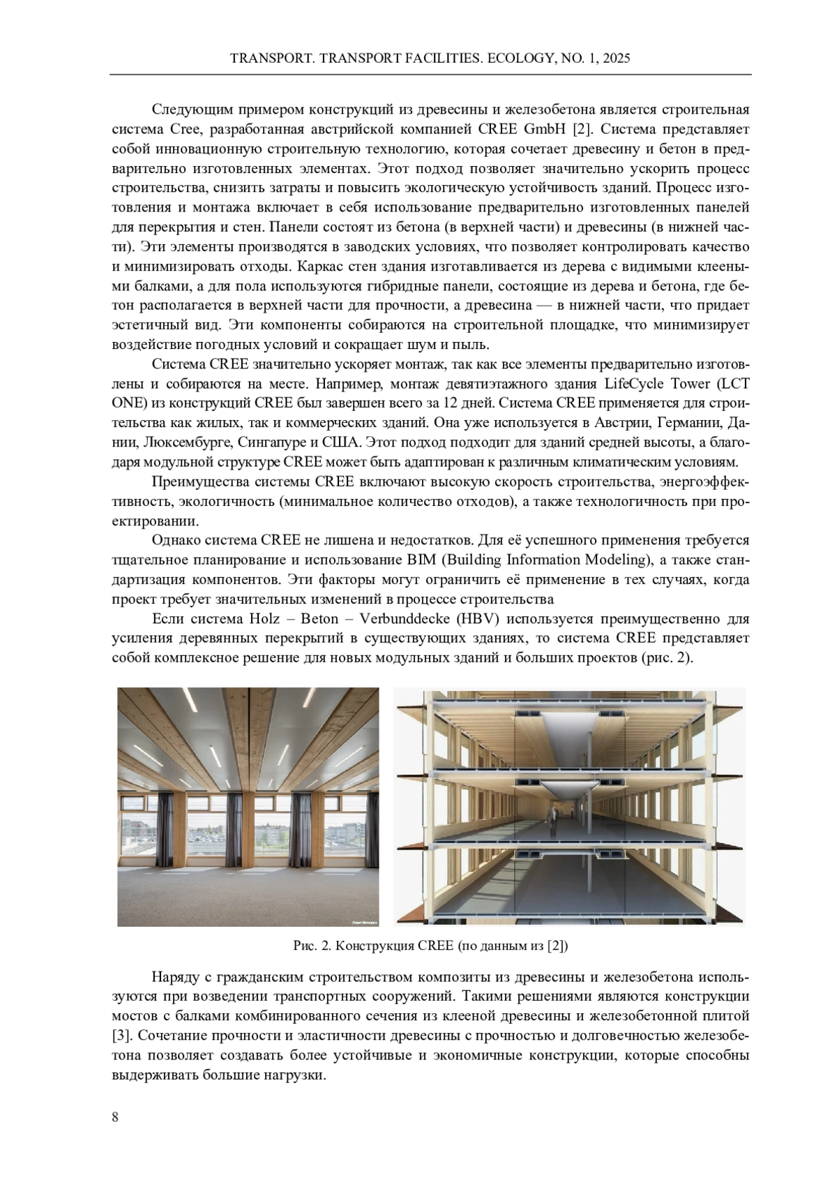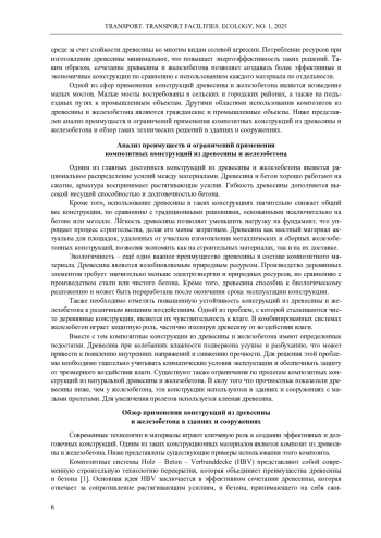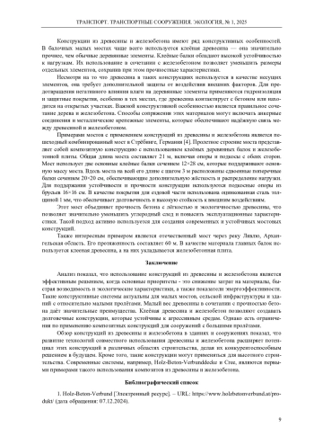 Анализируются композитные конструкции, созданные из древесины и железобетона, которые успешно сочетают преимущества обоих материалов. Подчеркивается рациональное распределение усилий между древесиной и бетоном, что делает такие конструкции экономически выгодными. Древесина, являясь возобновляемым ресурсом, снижает ресурсоёмкость строительства, а бетон обеспечивает долговечность и устойчивость к внешним воздействиям. Отмечено, что сооружения с использованием конструкций из древесины и железобетона отличаются энергоэффективностью и экологичостью. Рассмотрены основные области применения композита из древесины и железобетона. К ним относятся гражданские и промышленные здания, малые мосты и инфраструктурные объекты. Особое внимание уделено современным технологиям, которые демонстрируют эффективность таких материалов при реконструкции исторических зданий и новом строительстве. Отмечены ограничения по величине пролета и условиям эксплуатации. Сделаны выводы о перспективности использования древесно-бетонных композитов для устойчивого и экологичного строительства.