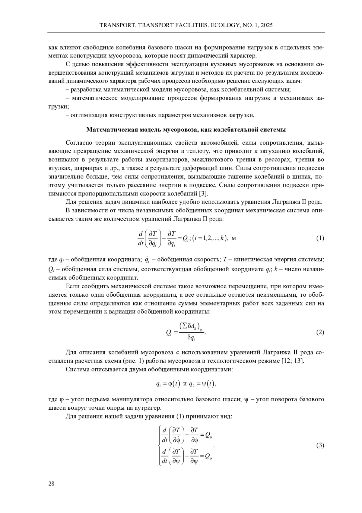 Обоснована актуальность проведения исследования динамического характера рабочих процессов кузовных мусоровозов с учетом свободных колебаний рамы автомобиля. Обобщены результаты исследований влияния конструктивного исполнения манипуляторов кузовных мусоровозов с боковой загрузкой на формирование усилий в конструктивных элементах мусоровоза при взаимодействии их с нагрузкой, создаваемой весом контейнера при выполнении рабочих операций: подъем, опрокидывание, опускание. Составлена модель и приведена расчетная схема мусоровоза как колебательной системы. Определен характер колебаний рамы мусоровоза в рабочем режиме. Установлены закономерности формирования усилий в системе «захват - бак - захват». С учетом свободных затухающих колебаний базового шасси выполнены исследования формирования нагрузок и оптимизация параметров серийно выпускаемых механизмов загрузки, а также оригинальных технических решений, подтвержденных патентами на изобретения. Для определения нагрузок, возникающих в системе «захват - бак - захват» серийного «вилочного» захвата, разработаны расчетные схемы и составлены уравнения равновесия действия сил. Полученные зависимости позволяют оценить изменение величины усилий в элементах конструкции захвата за рабочий цикл работы манипулятора с учетом колебаний базового шасси и их отклонение от статических нагрузок. Моделированием сил и моментов в элементах новой конструкции захвата, обеспечивающей вертикальное положение контейнера в процессе его подъема, установлено, что после затухания колебаний базового шасси происходит стабилизация всех сил, действующих в системе, моменты компенсируют действие друг друга таким образом, что суммарный момент стремится к нулю. На основании выполненных исследований дано решение актуальной научно-технической задачи, состоящей в совершенствовании методов расчета машин для сбора и вывоза твердых коммунальных отходов, обеспечивающих повышение эффективности их эксплуатации за счет снижения усилий в элементах конструкции захвата, повышения надежности системы «захват - бак - захват» манипулятора и его привода, повышения производительности мусоровозов и экологичности их работы.