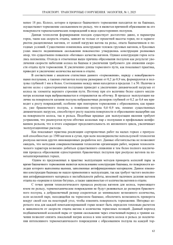 Представлены проблемы термомеханических повреждений колес грузовых вагонов при их роспуске на немеханизированных горках. Колесо, которое в процессе башмачного торможения находится не на башмаке, осуществляет торможение скольжением по рельсу, что и является причиной образования на его поверхности термомеханических повреждений в виде односторонних ползунов. Предложена конструкция противоползунной системы, обеспечивающая возможность проворота колеса вокруг своей оси на некоторый угол, чтобы изменить поверхность торможения. Установка на тормозной позиции немеханизированной горки систем противоползунной системы не вносит изменений в практику технологии башмачного торможения. На основе математического моделирования проведен тепловой расчет для определения минимально допустимой длины торможения колеса в режиме юза для немеханизированной горки. В качестве граничного критерия оценки допустимой продолжительности юза принята температура на поверхности контакта неподбашмаченного колеса и рельса. На основе результатов проведенных исследований сделаны выводы о динамике формирования неравномерного изнашивания кругов катания колесных пар и решены вопросы оптимизации физико-механических характеристик разгружающего модуля противоползунной системы работающей в динамически нагруженных условиях эксплуатации. Режим юза как процесс при торможении отцепов на немеханизированных горках является частью технологического процесса, поэтому в работе была поставлена задача определить рациональную его длину, при которой сформированная при торможении поверхность контакта не будет переходить в стадию интенсивного изнашивания. Решен вопрос определения оптимальной твердости разгружающей балки и минимизации угла поворота колеса относительно рельса.