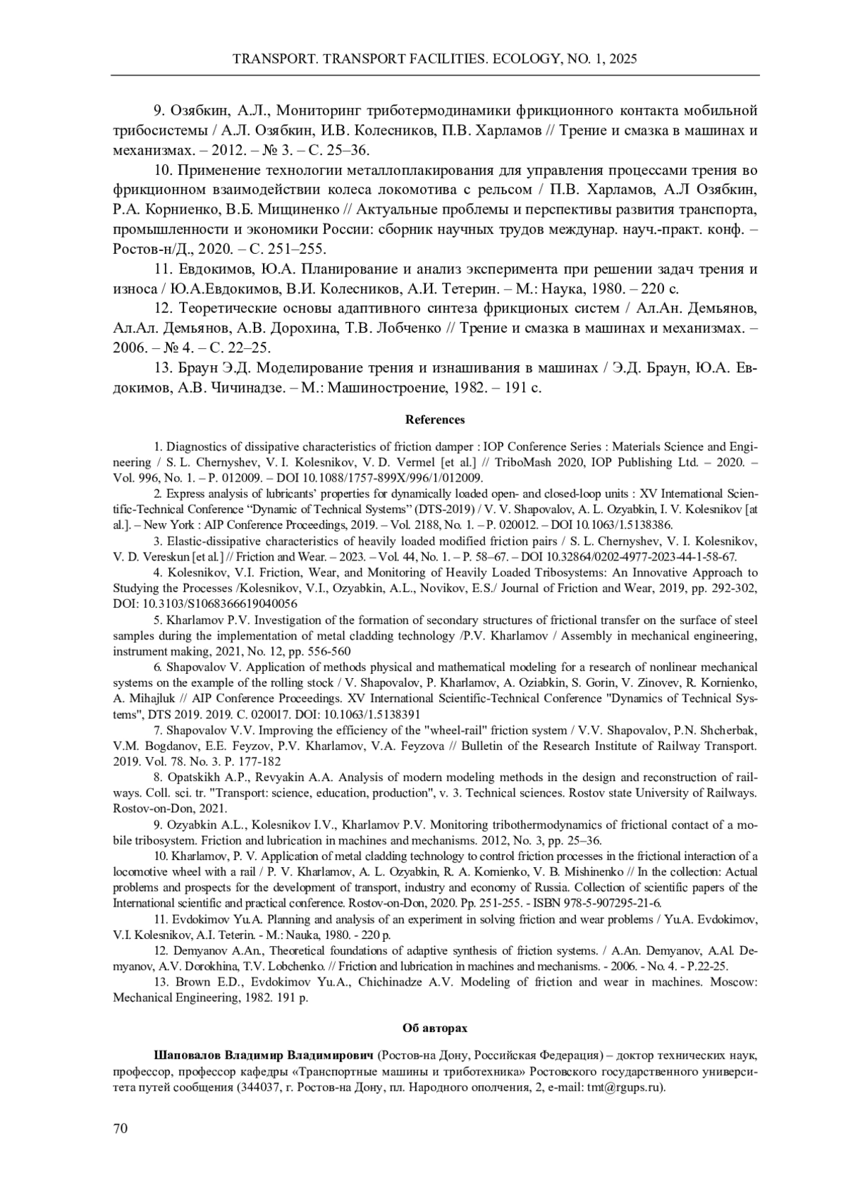 4. 	Kolesnikov, V.I. Friction, Wear, and Monitoring of Heavily Loaded Tribosystems: An Innovative Approach to Studying the Processes / V.I. Kolesnikov, A.L. Ozyabkin, E.S. Novikov / Journal of Friction and Wear. - 2019. - Vol. 4. - Р. 292-302. DOI: 10.3103/S1068366619040056