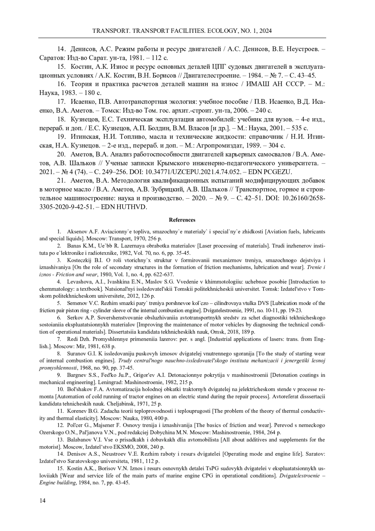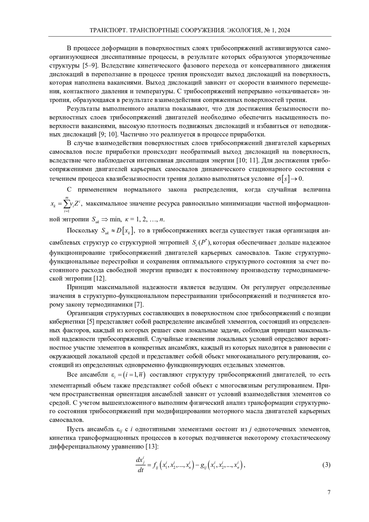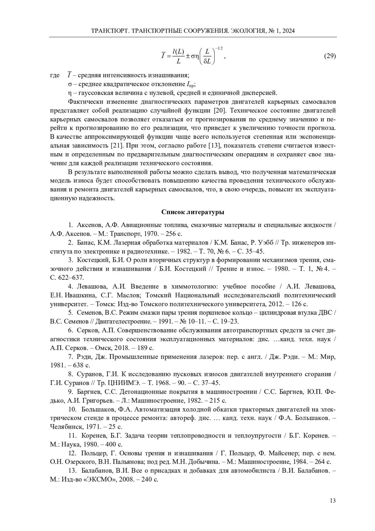Предложена математическая модель износа двигателей карьерных самосвалов при модифицировании моторного масла. При этом работоспособность каждого элемента пары трения при модифицировании моторного масла увеличивается, а интенсивность работы отдельных элементов двигателя в процессе работы находится во временном интервале. Полученные выражения позволяют описать работоспособность пар трения двигателей карьерных самосвалов и дают полезную информацию о структурной перестройке в поверхностных слоях пар трения при модифицировании моторного масла двигателей карьерных самосвалов. Для оценки точности остаточного ресурса двигателей карьерных самосвалов было предложено определить среднее квадратическое отклонение диагностического параметра и, в зависимости от принятой доверительной вероятности, определить отклонения диагностического параметра от его первоначального теоретического значения. По значению остаточного ресурса двигателей путем сравнения его с сезонной наработкой необходимо принимать решение о своевременном проведении технического обслуживания или ремонта двигателей карьерных самосвалов. Также при рассмотрении поверхностного слоя в неоднородном физическом поле была получена математическая модель износа пар трения двигателей карьерных самосвалов. Эффективность разработок триботехнических материалов прежде всего определяется их свойствами и промышленным применением. Важная роль при этом принадлежит триботехническим характеристикам присадок в моторное масло, которые выполняют функции параметра оптимизации при разработке технологий и основного критерия в процессе выбора материалов для пар трения двигателей карьерных самосвалов. Они отражают состояние пар трения двигателей карьерных самосвалов, элементами которых являются контактирующие и смазочные материалы.