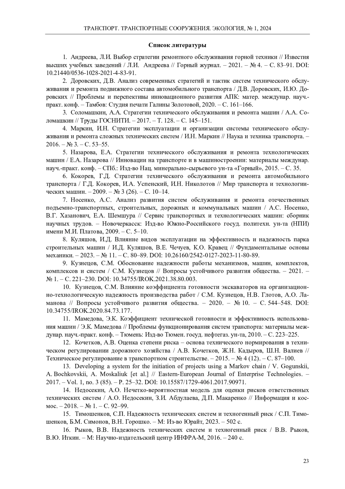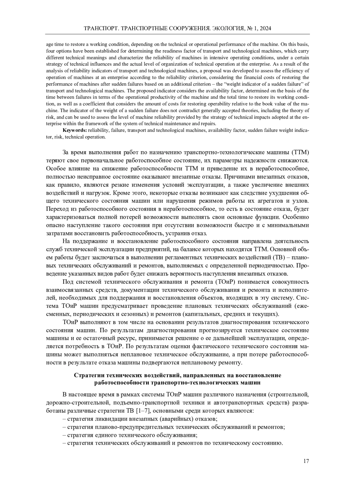 В процессе эксплуатации транспортно-технологических машин происходит ухудшение их технического состояния и потеря работоспособности, в том числе из-за внезапных отказов. Поддержанием и восстановлением работоспособного состояния машин занимаются службы технической эксплуатации предприятий путем применения различных стратегий технических воздействий в рамках системы технических обслуживаний и ремонтов. Оценку эффективности эксплуатации машин принято производить на основе фактических показателей надежности, основными из которых являются коэффициент готовности и средняя наработка между отказами, которые не в полной мере позволяют оценить уровень организации эксплуатации машин на предприятии. В данном исследовании для транспортно-технологических машин установлены варианты определения средней наработки между отказами и среднего времени восстановления работоспособного состояния в зависимости от технической или эксплуатационной производительности машины. На этой основе установлены четыре варианта определения коэффициента готовности транспортно-технологических машин, несущих различный технический смысл и характеризующих надежность машин в интенсивных условиях эксплуатации, при определенной стратегии технических воздействий и фактическом уровне организации технической эксплуатации на предприятии. В результате анализа показателей надежности транспортно-технологических машин разработано предложение о проведении оценки эффективности эксплуатации машин на предприятии по критерию надежности с учетом финансовых затрат на восстановление работоспособности машин после внезапных отказов на основании дополнительного критерия - «показателя весомости внезапного отказа» транспортно-технологических машин. Предлагаемый показатель учитывает коэффициент готовности, определенный на основании наработки между отказами по эксплуатационной производительности машины и общего времени восстановления ее работоспособного состояния, а также коэффициент, учитывающий размер затрат на восстановление работоспособности относительно балансовой стоимости машины. Показатель весомости внезапного отказа не противоречит общепризнанным теориям, в том числе теории риска, и может быть использован для оценки уровня надежности машин, обеспечиваемого принятой на предприятии стратегией технических воздействий в рамках системы технических обслуживаний и ремонтов.