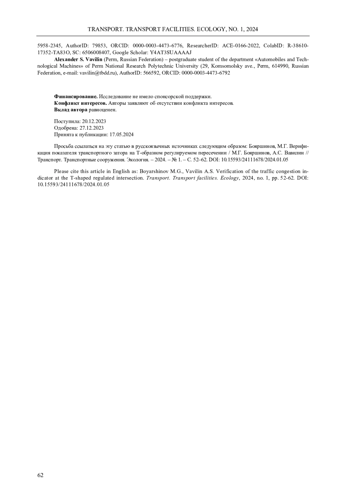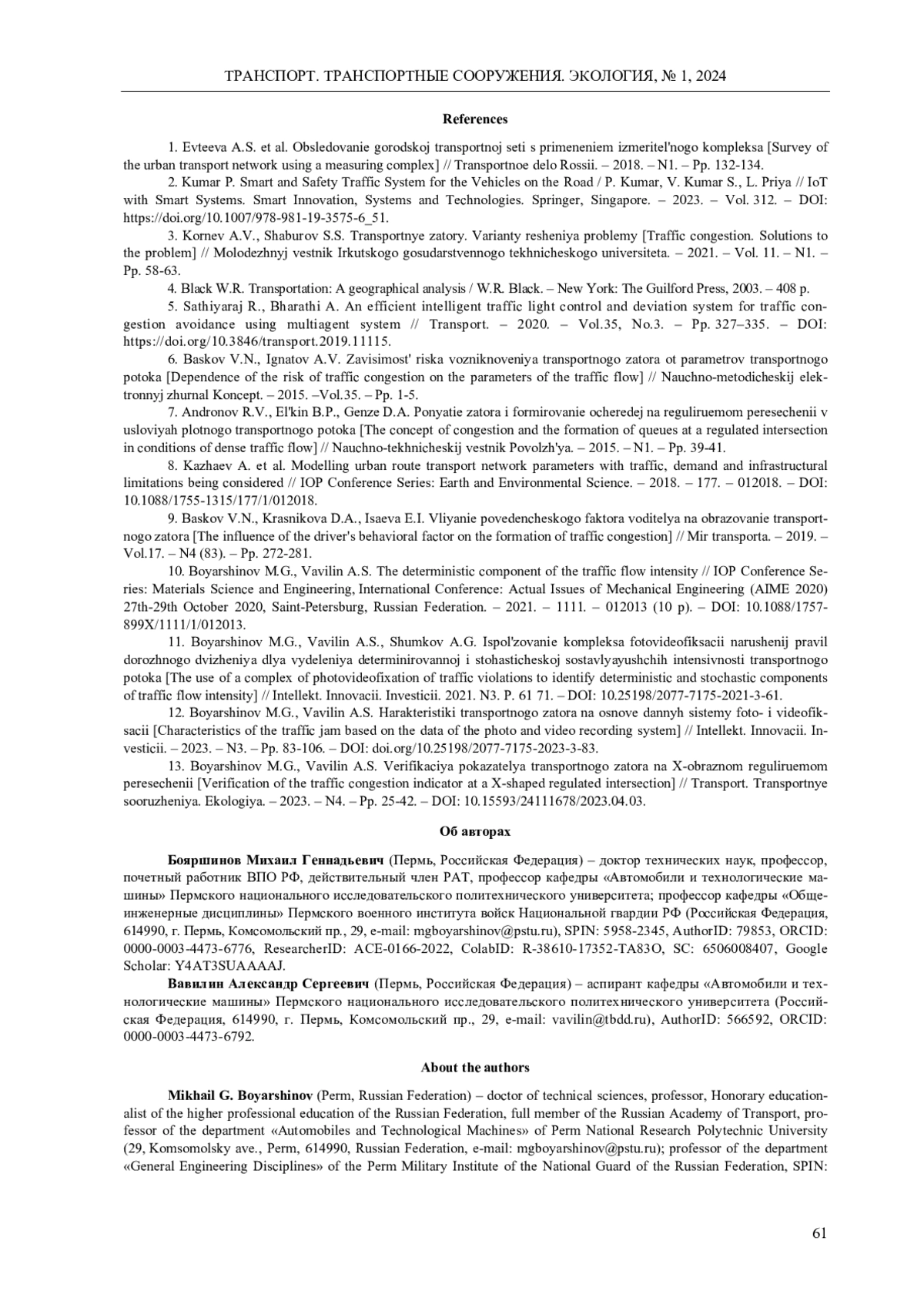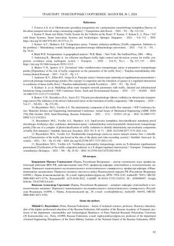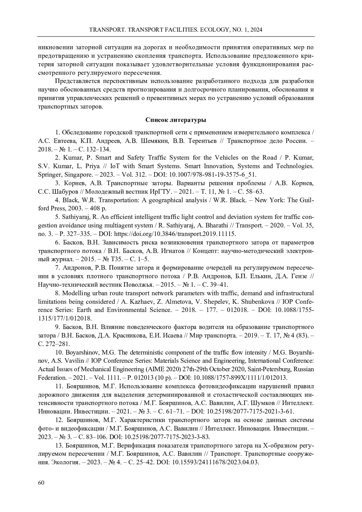 13. 	Бояршинов, М.Г. Верификация показателя транспортного затора на Х-образном регулируемом пересечении / М.Г. Бояршинов, А.С. Вавилин // Транспорт. Транспортные сооружения. Экология. - 2023. - № 4. - С. 25-42.  DOI: 10.15593/24111678/2023.04.03  EDN: SNIGUK