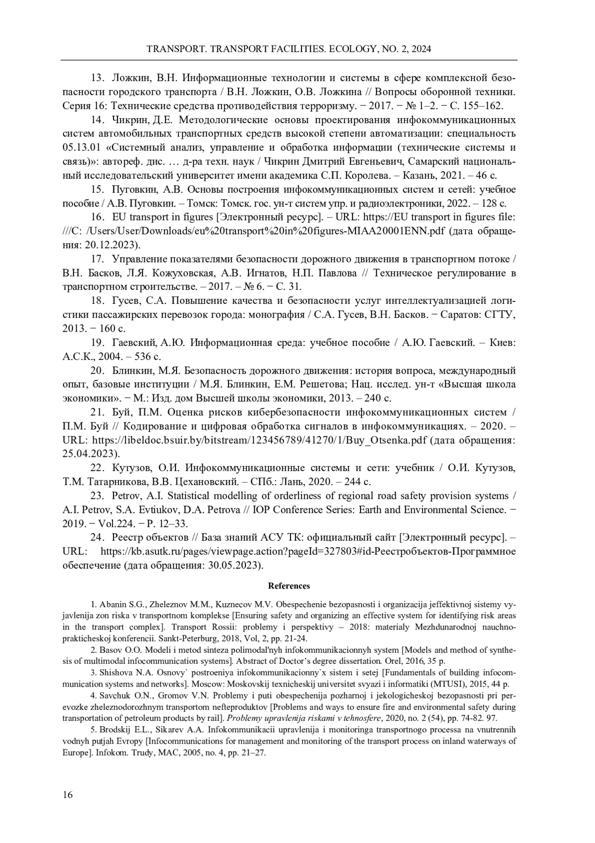 1. Абанин, С.Г. Обеспечение безопасности и организация эффективной системы выявления зон риска в транспортном комплексе / С.Г. Абанин, М.М. Железнов, М.В. Кузнецов // Транспорт России: проблемы и перспективы - 2018: материалы международной научно-практической конференции. 13-14 ноября 2018 г. СПб.: ИПТ РАН. - СПб., 2018. - Т. 2. - С. 21-24. EDN: HMBVDT