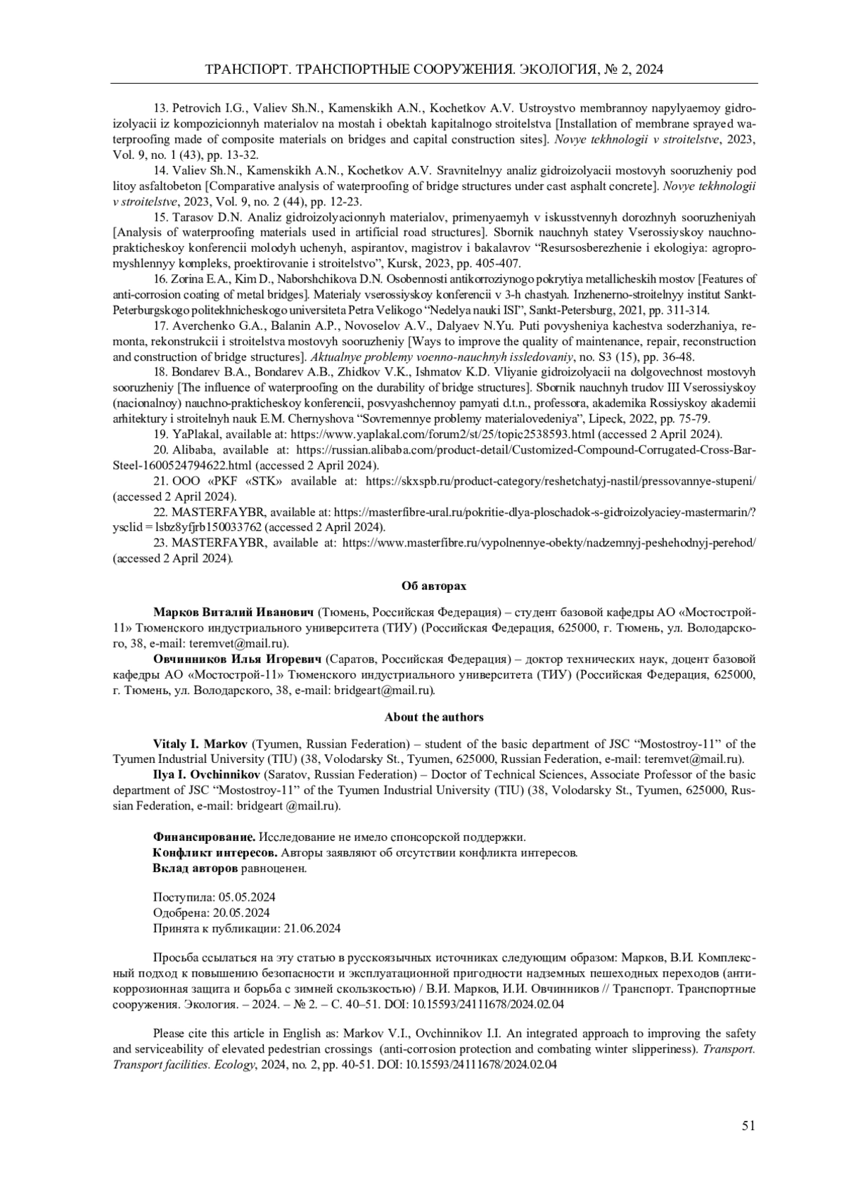 13. Устройство мембранной напыляемой гидроизоляции из композиционных материалов на мостах и объектах капитального строительства / И.Г. Петрович, Ш.Н. Валиев, А.Н. Каменских, А.В. Кочетков // Новые технологии в строительстве. - 2023. - Т. 9, № 1 (43). - С. 13-32. EDN: PLAHHA